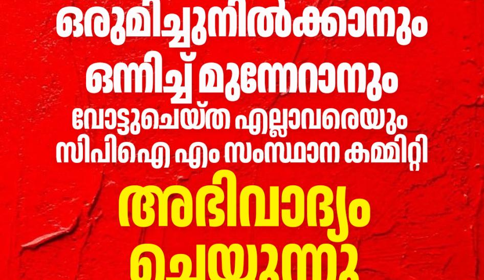 നവകേരളനിർമിതിക്കായുള്ള തുടർച്ചയ്‌ക്കായി ഒരുമിച്ചുനിൽക്കാനും ഒന്നിച്ച്‌ മുന്നേറാനും വോട്ടുചെയ്‌ത എല്ലാവരെയും സിപിഐ എം സംസ്ഥാന കമ്മിറ്റി അഭിവാദ്യം ചെയ്യുന്നു