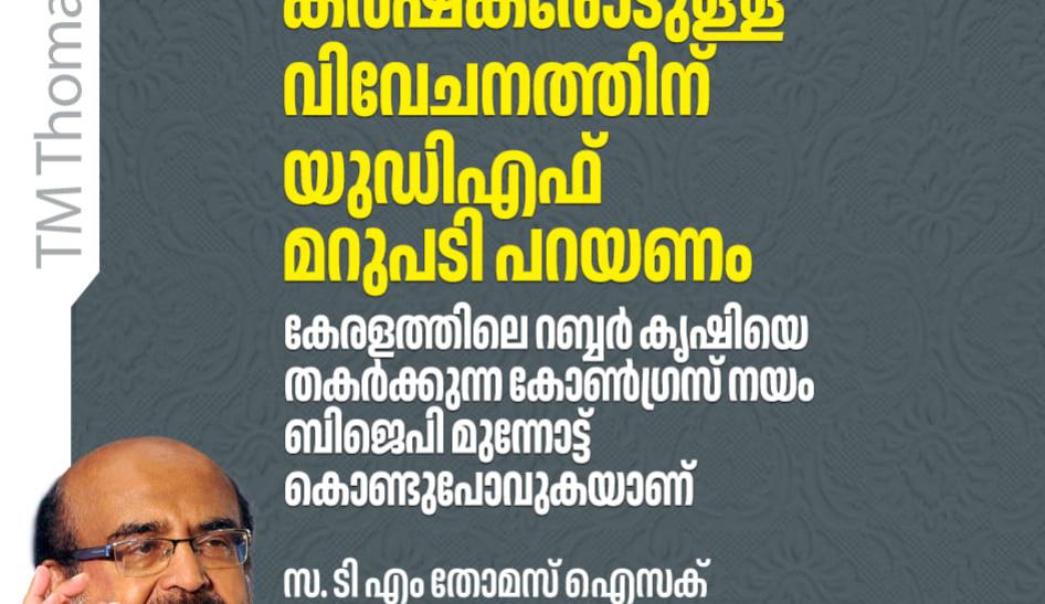ഇന്ത്യയിലെ 90 ശതമാനം റബ്ബറും ഉൽപ്പാദിപ്പിക്കുന്ന കേരളത്തിലെ റബ്ബർ കൃഷിയെ തകർക്കുന്നതിന് നീതി ആയോഗിന്റെ ഗൂഡപദ്ധതിയുടെ കൂടുതൽ വിവരങ്ങൾ പുറത്തുവന്നുകൊണ്ടിരിക്കുന്നു. റബ്ബർ മേഖലയ്ക്ക് പ്രോത്സാഹനം ആവശ്യമില്ലാത്തവിധം വളർന്നൂവെന്നാണ് നീതി ആയോഗിന്റെ നിരീക്ഷണം.