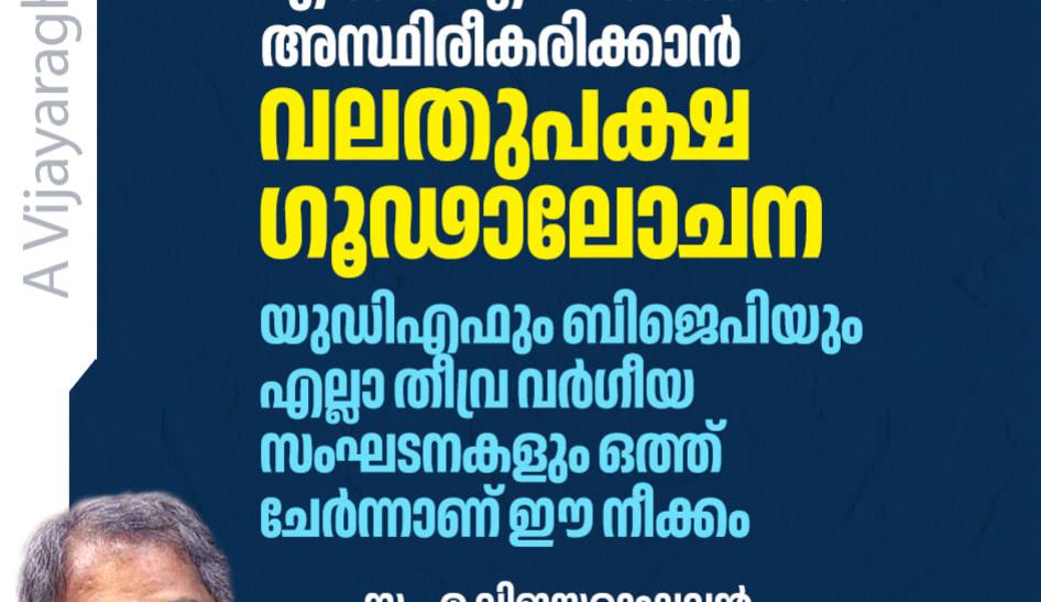 കേരളത്തിലെ എൽഡിഎഫ് സർക്കാരിനെ അസ്ഥിരീകരിക്കാൻ വലതുപക്ഷ ഗൂഢാലോചന നടക്കുകയാണ്. കേന്ദ്രസർക്കാരിന്റെ നയങ്ങൾക്ക് ബദലായി വൻ വികസന കുതിപ്പ് കേരളം നടത്തുകയാണ്. ഈ മുന്നേറ്റം അട്ടിമറിക്കാനാണ് നീക്കം. യുഡിഎഫും ബിജെപിയും എല്ലാ തീവ്ര വർഗീയ സംഘടനകളും ഒത്ത് ചേർന്നാണ് സർക്കാരിനെതിരെ രംഗത്തുവന്നിരിക്കുന്നത്.