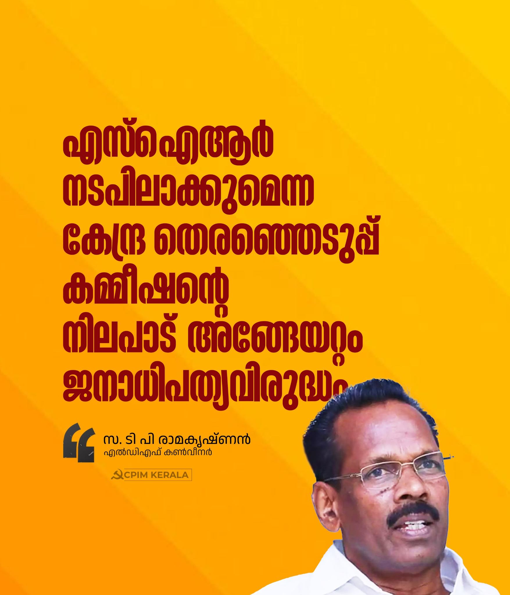 എസ്ഐആര് നടപിലാക്കുമെന്ന കേന്ദ്ര തെരഞ്ഞെടുപ്പ് കമ്മീഷന്റെ നിലപാട് അങ്ങേയറ്റം ജനാധിപത്യവിരുദ്ധമാണ്. രാജ്യത്ത് ജനങ്ങള്ക്ക് വോട്ടവകാശം ഉറപ്പുവരുത്തുന്നതിന് ഉത്തരവാദിത്വമുള്ള ഭരണഘടനാസ്ഥാപനമായ തെരഞ്ഞെടുപ്പ് കമ്മീഷന് അതിന്റെ വിശ്വാസ്യത കളയുന്ന തരത്തിലുള്ള പ്രവര്ത്തനങ്ങളാണ് കഴിഞ്ഞ കുറച്ച് കാലമയി നടപ്പിലാക്കികൊണ്ടിരിക്കുന്നത്. ലക്ഷക്കണക്കിന് വോട്ടര്മാരുടെ വോട്ടവകാശം ഇല്ലാതാക്കുന്ന നടപടിയാണ് തുടര്ച്ചയായി കമ്മീഷന് സ്വീകരിച്ചുകൊണ്ടിരിക്കുന്നത്. സംഘപരിവാറിന്റെ രാഷ്ട്രീയ താല്പര്യം സംരക്ഷിക്കുന്നവിധമുള്ള പ്രവര്ത്തനമാണ് ഇപ്പോള് നടത്തികൊണ്ടിരിക്കുന്നത്.