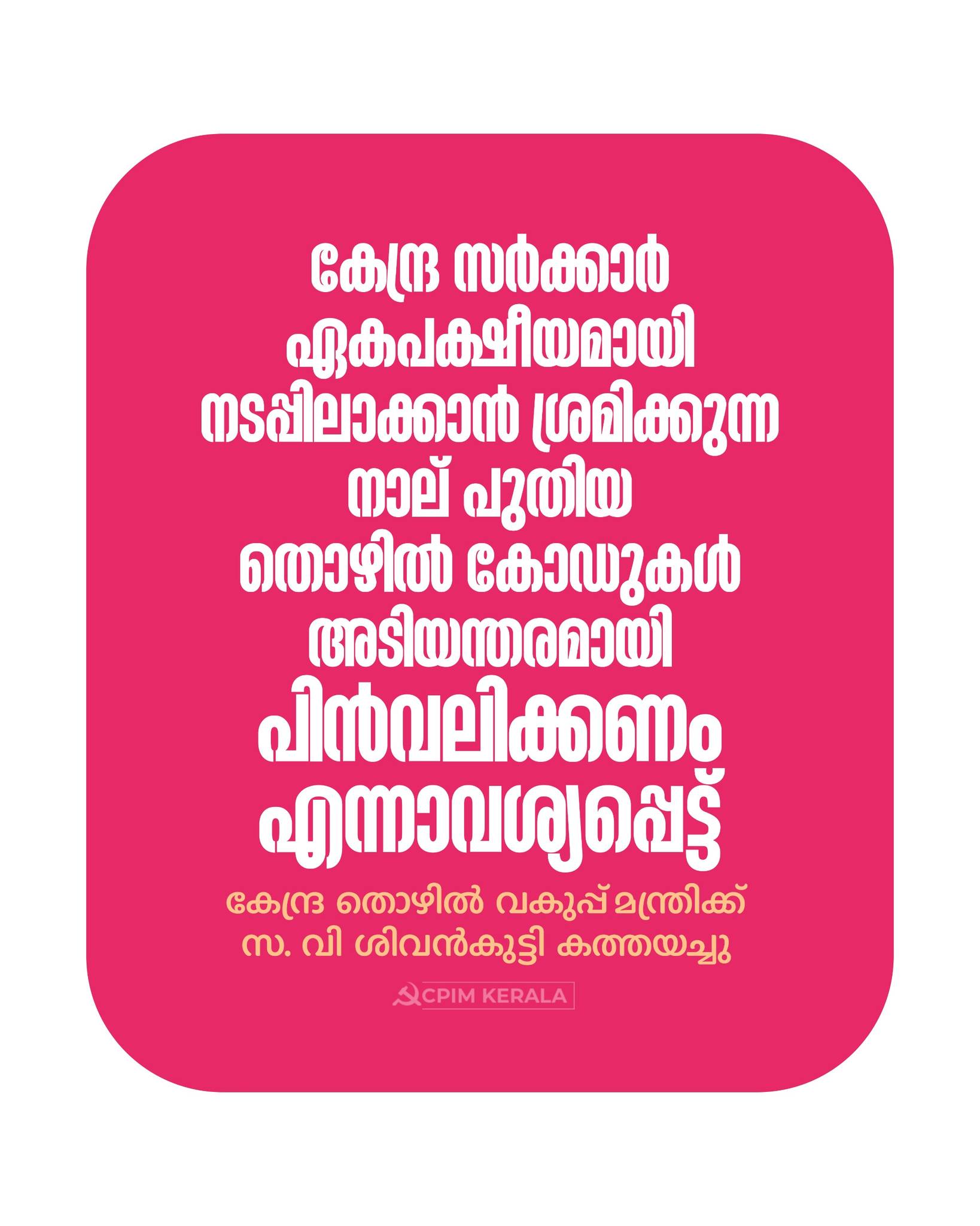 ഭരണഘടനയുടെ കൺകറന്റ് ലിസ്റ്റിൽ ഉൾപ്പെടുന്ന വിഷയമായിട്ടും സംസ്ഥാന സർക്കാരുകളുമായോ ട്രേഡ് യൂണിയനുകളുമായോ ചർച്ച ചെയ്യാതെയാണ് കേന്ദ്രം ഈ തീരുമാനം എടുത്തത്. തൊഴിൽ സുരക്ഷ, കൂട്ടായ വിലപേശലിനുള്ള അവകാശം, തൊഴിലിടങ്ങളിലെ സുരക്ഷ എന്നിവയിൽ വെള്ളം ചേർക്കുന്നതാണ് പുതിയ കോഡുകൾ. നിലവിലെ രൂപത്തിൽ കോഡുകൾ നടപ്പിലാക്കുന്നതിൽ നിന്ന് കേന്ദ്രസർക്കാർ പിന്മാറണം.