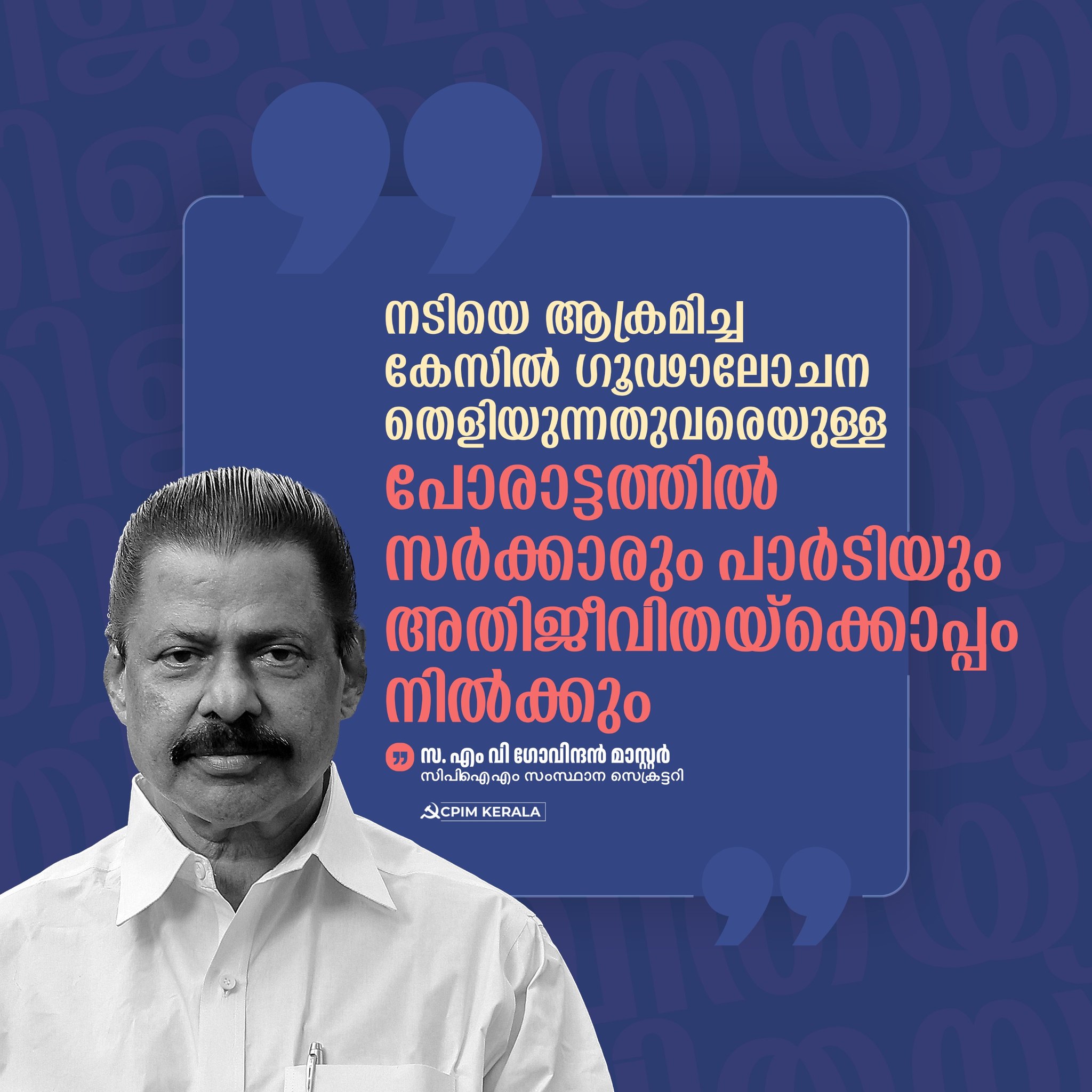 നടിയെ ആക്രമിച്ച കേസിൽ ഗൂഢാലോചന തെളിയിക്കുന്നതുവരെയുള്ള പോരാട്ടത്തിൽ സർക്കാരും പാർടിയും അതിജീവിതയ്ക്കൊപ്പം നിൽക്കും.