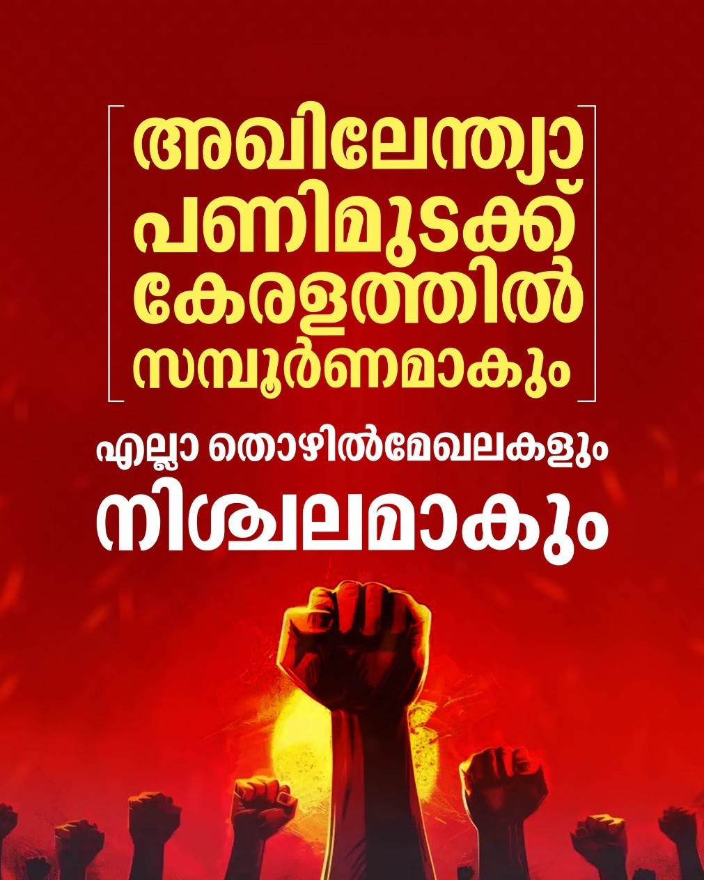 വിവിധ ആവശ്യങ്ങളുന്നയിച്ച് ഫെബ്രുവരി 12ന് നടക്കുന്ന അഖിലേന്ത്യാ പണിമുടക്ക് കേരളത്തിൽ സമ്പൂർണമാകും. സംസ്ഥാനത്തെ എല്ലാ തൊഴിൽമേഖലകളും നിശ്ചലമാകും. തൊഴിലുടമകൾക്കെല്ലാം പണിമുടക്ക് നോട്ടീസ് നൽകി. വ്യവസായ - കാര്ഷിക - വാണിജ്യ - വ്യാപാര മേഖലകള് 24 മണിക്കൂറും നിശ്ചലമാകും. കടകമ്പോളങ്ങള് അടയും, മോട്ടോര് വാഹനങ്ങള് നിരത്തില് ഇറങ്ങില്ല, എല്ലാ രംഗത്തെയും തൊഴിലാളികള് ഫെബ്രുവരി 12ന് പണി നിര്ത്തിവയ്ക്കും.