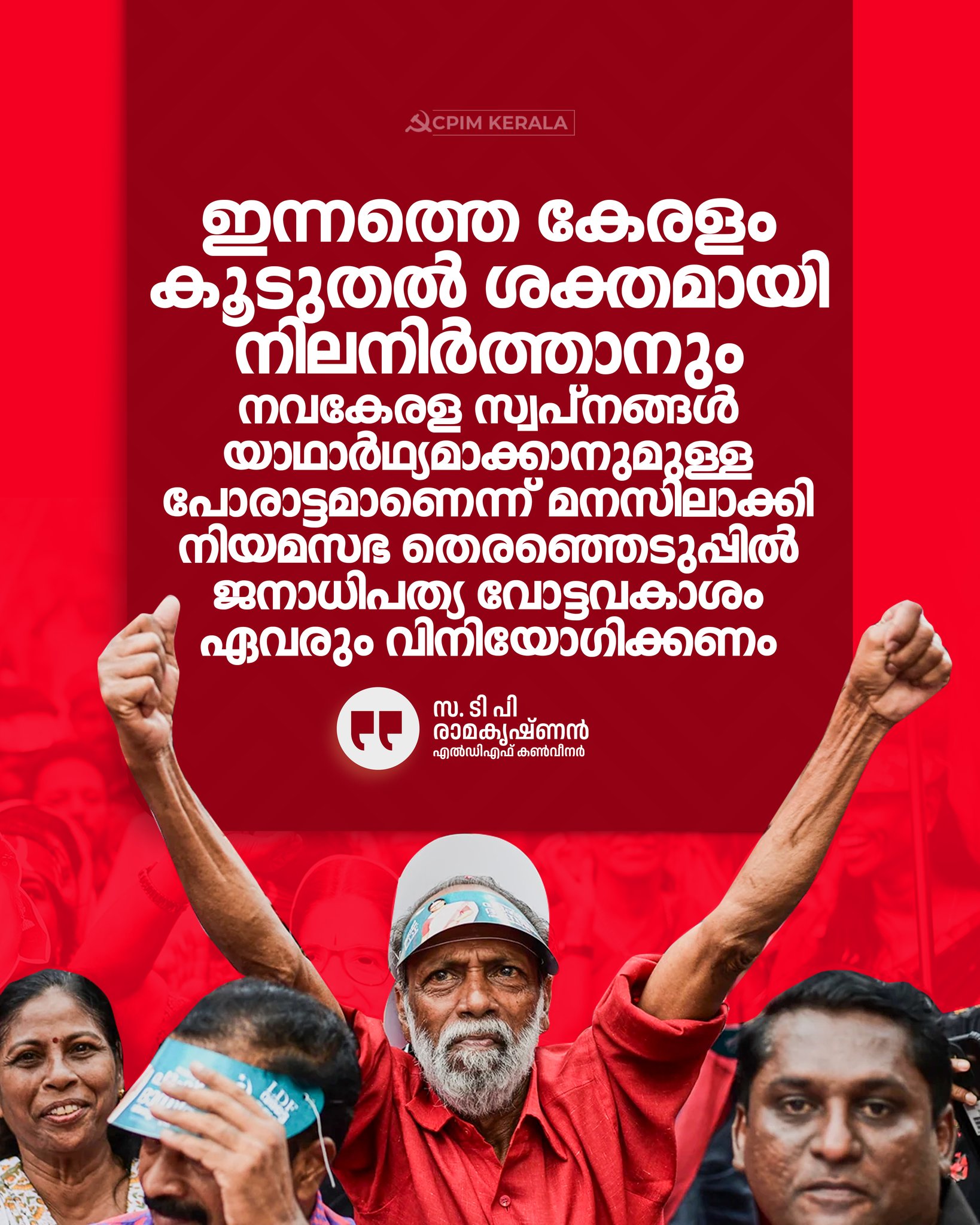 ഇന്നത്തെ കേരളം കൂടുതല് ശക്തമായി നിലനിര്ത്തിക്കൊണ്ടുപോകാനും നവകേരള സ്വപ്നങ്ങള് യാഥാര്ഥ്യമാക്കാനുമുള്ള പോരാട്ടമാണെന്ന് മനസിലാക്കി നിയമസഭ തെരഞ്ഞെടുപ്പില് ജനാധിപത്യ വോട്ടവകാശം ഏവരും വിനിയോഗിക്കണം. മുമ്പുള്ളതിനേക്കാള് കൂടുതല് സീറ്റുമായി എല്ഡിഎഫ് ഭരണ തുടര്ച്ച നേടുമെന്ന ഉറപ്പാണ് സംസ്ഥാനത്താകെയുള്ള ജനവികാരം കാണിക്കുന്നത്. സര്ക്കാരിനെതിരെ എന്തെങ്കിലും പറയാന് കഴിയാത്തവിധം പ്രതിസന്ധിയിലായ യുഡിഎഫിന്റെ അവസ്ഥ പരിതാപകരമാണ്. സര്ക്കാരിനെതിരെ അഴിമതിയാരോപണം ഉന്നയിക്കാനോ ഭരണവീഴ്ചകള് ചൂണ്ടിക്കാണിക്കാനോ കഴിയാതെ നിയമസഭയ്ക്കകത്തും പുറത്തും യുഡിഎഫ് തടിതപ്പിയത് കേരളം കണ്ടതാണ്. ജനങ്ങള് പരിപൂര്ണ തൃപ്തിയോടെ സര്ക്കാരിനെ കാണുന്നുവെന്നതിനാലാണ് അവര് വ്യാപകമായ വ്യാജ പ്രചാരവേല നടത്തുന്നത്.