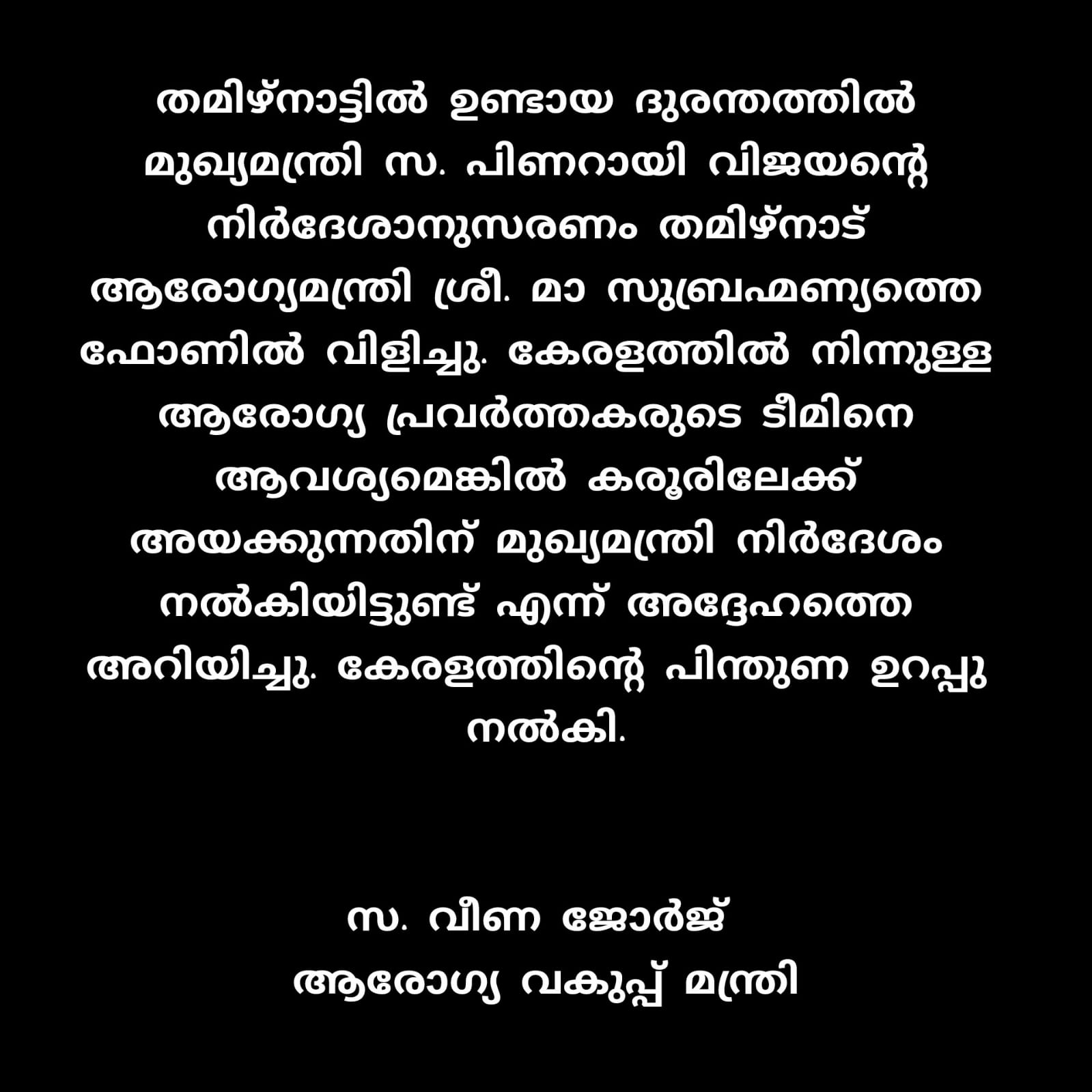 തമിഴ്നാട്ടിൽ ഉണ്ടായ ദുരന്തത്തിൽ മുഖ്യമന്ത്രി സ. പിണറായി വിജയന്റെ നിർദേശാനുസരണം തമിഴ്നാട് ആരോഗ്യമന്ത്രി ശ്രീ. മാ സുബ്രഹ്മണ്യത്തെ ഫോണിൽ വിളിച്ചു. കേരളത്തിൽ നിന്നുള്ള ആരോഗ്യ പ്രവർത്തകരുടെ ടീമിനെ ആവശ്യമെങ്കിൽ കരൂരിലേക്ക് അയക്കുന്നതിന് മുഖ്യമന്ത്രി നിർദേശം നൽകിയിട്ടുണ്ട് എന്ന് അദ്ദേഹത്തെ അറിയിച്ചു. കേരളത്തിന്റെ പിന്തുണ ഉറപ്പു നൽകി.