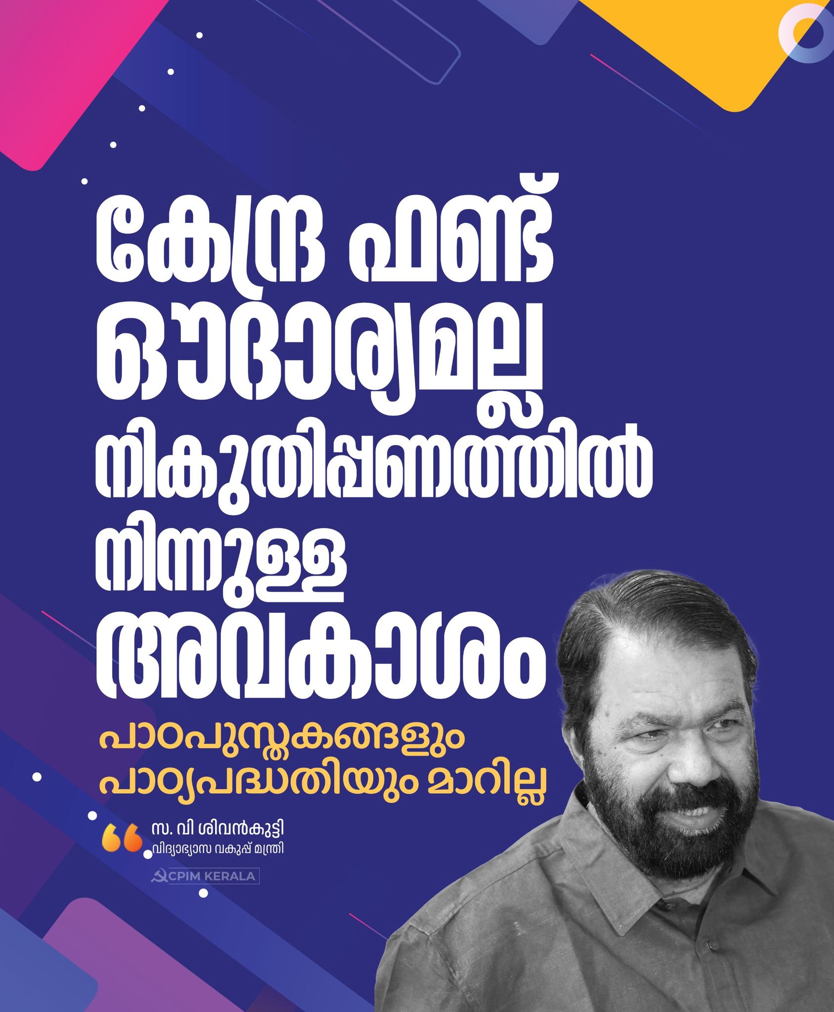 കുട്ടികളുടെ ഭാവി പന്താടിക്കൊണ്ട് ഒരു രാഷ്ട്രീയ സമ്മർദത്തിന് വഴങ്ങാൻ കേരളം തയ്യാറല്ല. ഈ ഫണ്ട് ഏതെങ്കിലും പാർടിയുടെ ഔദാര്യമല്ല, മറിച്ച് കേരളത്തിലെ ജനങ്ങളുടെ നികുതിപ്പണത്തിൽ നിന്നുള്ള, നമ്മുടെ കുട്ടികൾക്ക് അവകാശപ്പെട്ട വിഹിതമാണ്. ആ അവകാശം നേടിയെടുക്കുക എന്നതാണ് ഒരു ജനകീയ സർക്കാരിന്റെ ഉത്തരവാദിത്വം. ആർഎസ്എസ് അജണ്ടകൾ വിദ്യാഭ്യാസത്തിലൂടെ നടപ്പാക്കാനുള്ള കേന്ദ്ര സർക്കാരിന്റെ നയങ്ങൾക്കെതിരായ കേരളത്തിന്റെ പോരാട്ടം തുടരുക തന്നെ ചെയ്യും. കേരളത്തിന്റെ പൊതുവിദ്യാഭ്യാസത്തിന്റെ നട്ടെല്ലായ മതനിരപേക്ഷ, ജനാധിപത്യ, ശാസ്ത്രീയ ഉള്ളടക്കത്തിൽ ഒരു വിട്ടുവീഴ്ചയും ഉണ്ടാകില്ല എന്ന് ഉറപ്പ് നൽകുന്നു.