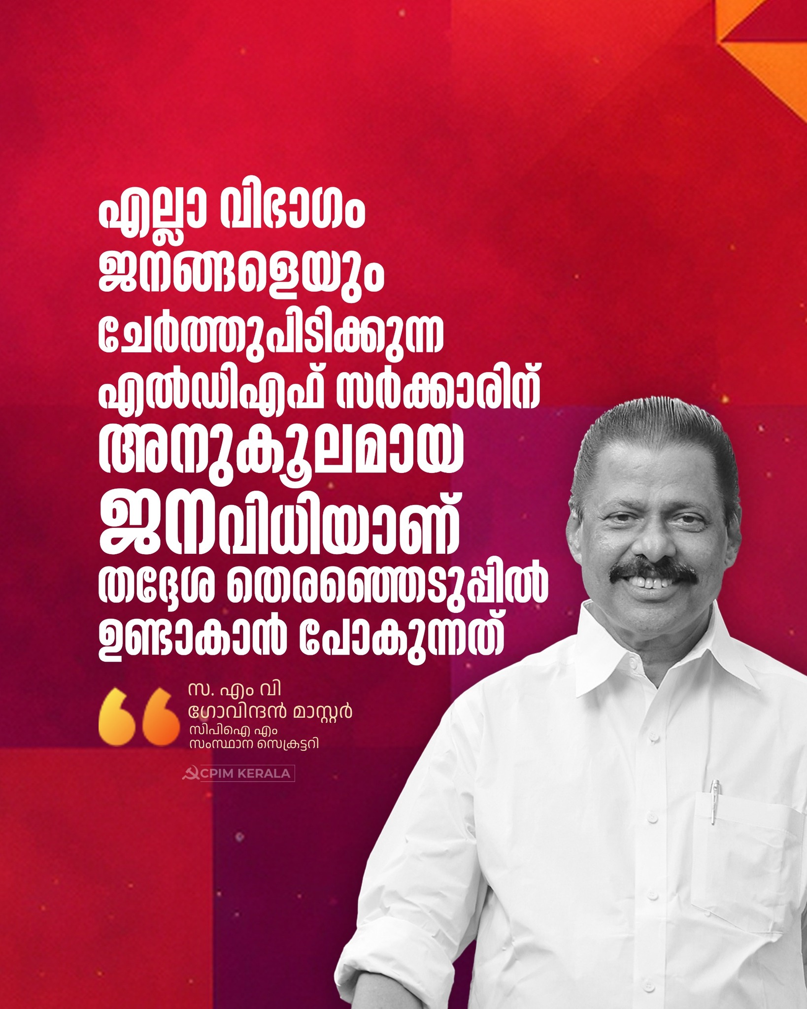 കേരളത്തിൽ തദ്ദേശഭരണ സ്ഥാപനങ്ങളിലേക്കുള്ള വോട്ടെടുപ്പുതീയതി പ്രഖ്യാപിച്ചതോടെ ഒരുമാസം നീളുന്ന തെരഞ്ഞെടുപ്പുപ്രക്രിയക്ക് തുടക്കമായി. തെക്ക്– മധ്യ കേരളത്തിലെ ഏഴു ജില്ലകളിൽ ഡിസംബർ ഒമ്പതിനും വടക്കൻ കേരളത്തിൽ ഏഴു ജില്ലകളിൽ 11നുമാണ് തെരഞ്ഞെടുപ്പ്. ഡിസംബർ 13നാണ് ഫലപ്രഖ്യാപനം. 2020ൽ നല്ല വിജയമാണ് എൽഡിഎഫിനുണ്ടായത്. എറണാകുളം, മലപ്പുറം, വയനാട് ഒഴിച്ചുള്ള 11 ജില്ലാപഞ്ചായത്തുകളിലും കണ്ണൂർ ഒഴിച്ചുള്ള അഞ്ച് കോർപറേഷനുകളിലും 87 മുനിസിപ്പാലിറ്റിയിൽ 47ലും 152 ബ്ലോക്ക് പഞ്ചായത്തുകളിൽ 44ലും 941 പഞ്ചായത്തുകളിൽ 582ലും വിജയിച്ചത് എൽഡിഎഫായിരുന്നു. അന്ന് ലഭിച്ച വോട്ടിന്റെ അടിസ്ഥാനത്തിൽ ഭൂരിപക്ഷം നിയമസഭാ മണ്ഡലങ്ങളിൽ എൽഡിഎഫ് മുന്നിലായിരുന്നു. 2021ലെ നിയമസഭയിൽ 99 സീറ്റ് നേടി പിണറായി വിജയൻ സർക്കാരിന് തുടർഭരണം ലഭിക്കുകയും ചെയ്തു. സമാനമായ സാഹചര്യത്തിലേക്കാണ് കേരളം പോകുന്നത്. തുടർച്ചയായി മൂന്നാമതും അധികാരത്തിലേറാനുള്ള എൽഡിഎഫിന്റെ ജൈത്രയാത്രയ്‌ക്ക് അടിത്തറയിടുന്നതായിരിക്കും തദ്ദേശസ്ഥാപനങ്ങളിലെ ഫലം.
