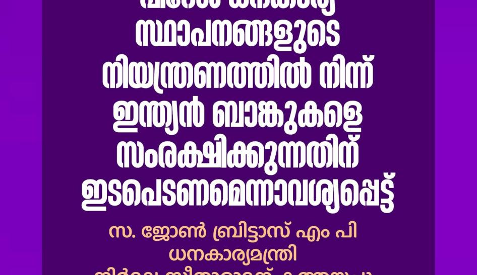 വിദേശ ധനകാര്യ സ്ഥാപനങ്ങളുടെ നിയന്ത്രണത്തിൽ നിന്ന് ഇന്ത്യൻ ബാങ്കുകളെ സംരക്ഷിക്കുന്നതിന് ഇടപെടണമെന്നാവശ്യപ്പെട്ട് സ. ജോൺ ബ്രിട്ടാസ് ധനകാര്യമന്ത്രിക്ക് കത്തയച്ചു