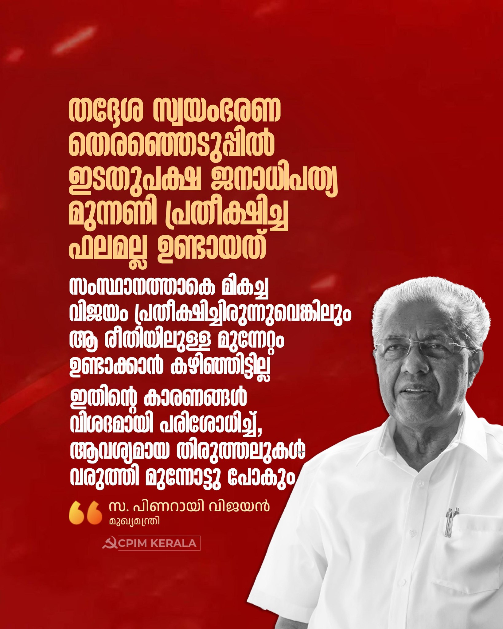 തദ്ദേശ സ്വയംഭരണ തെരഞ്ഞെടുപ്പിൽ ഇടതുപക്ഷ ജനാധിപത്യ മുന്നണി പ്രതീക്ഷിച്ച ഫലമല്ല ഉണ്ടായത്. സംസ്ഥാനത്താകെ മികച്ച വിജയം പ്രതീക്ഷിച്ചിരുന്നുവെങ്കിലും ആ രീതിയിലുള്ള മുന്നേറ്റം ഉണ്ടാക്കാൻ കഴിഞ്ഞിട്ടില്ല. ഇതിന്റെ കാരണങ്ങൾ വിശദമായി പരിശോധിച്ച്, ആവശ്യമായ തിരുത്തലുകൾ വരുത്തി മുന്നോട്ടു പോകും.