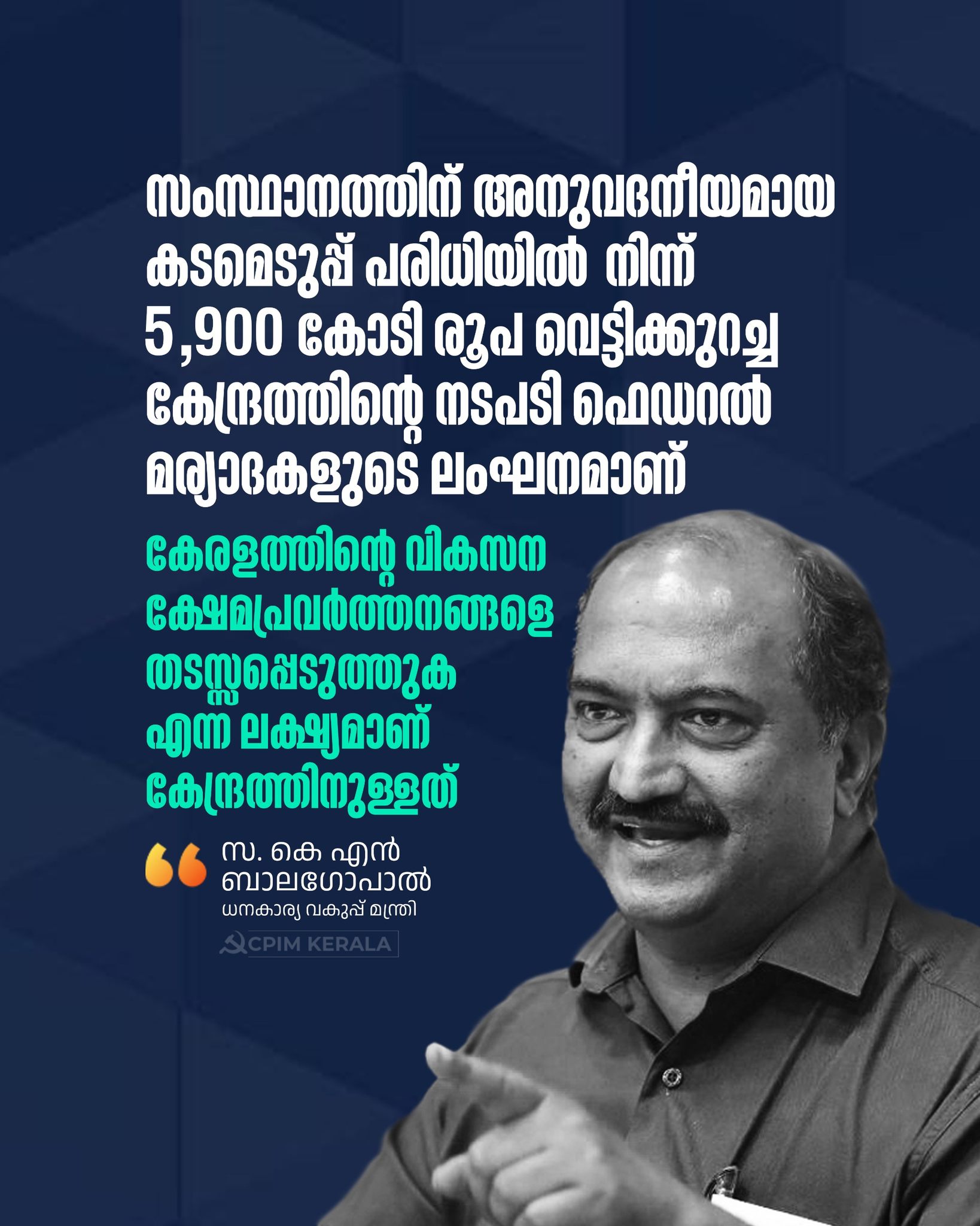 നടപ്പു സാമ്പത്തിക വർഷത്തിലെ അവസാന പാദത്തിൽ സംസ്ഥാനത്തിന് അനുവദനീയമായ കടമെടുപ്പ് പരിധിയിൽ നിന്ന് 5,900 കോടി രൂപ വെട്ടിക്കുറച്ച കേന്ദ്രത്തിന്റെ നടപടി ഫെഡറൽ മര്യാദകളുടെ ലംഘനമാണ്. യാതൊരുവിധത്തിലും ഇത് നീതീകരിക്കാൻ കഴിയില്ല. മലയാളികളോടുള്ള കേന്ദ്രസർക്കാരിന്റെ യുദ്ധപ്രഖ്യാപനമാണിത്. ബഹുവിധത്തിൽ കേരളത്തിന് അർഹമായ നികുതി വിഹിതം കേന്ദ്രം നിഷേധിക്കുന്നതിന് പുറമെയാണ് ഇരുട്ടടി പോലെയുള്ള ഈ തീരുമാനം. ബുധനാഴ്ച രാത്രി കേന്ദ്രത്തിൽ നിന്ന് ലഭിച്ച കത്തിലൂടെയാണ് കേരള വിരുദ്ധമായ ഈ തീരുമാനം സർക്കാർ അറിയുന്നത്.