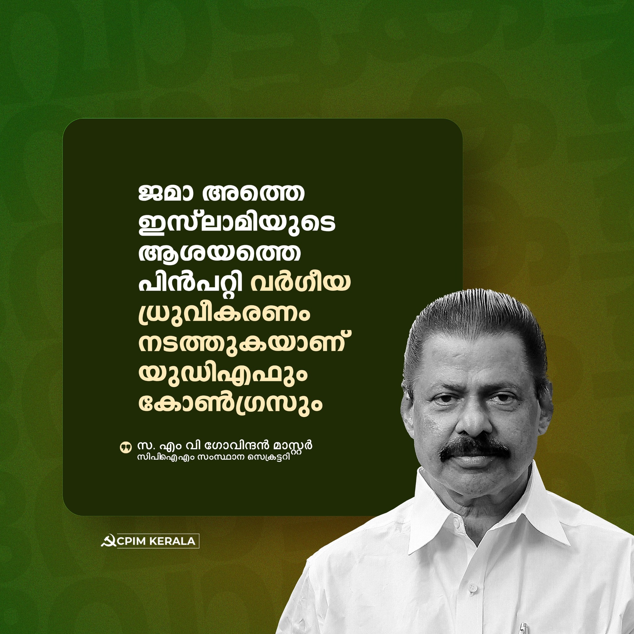 മാറാട് കലാപത്തെ കുറിച്ച് പറയുന്നതിൽ എന്താണ് പ്രയാസം. ജമാഅത്തെ ഇസ്ലാമിയുടെ ആശയത്തെ പിൻപറ്റി വർഗീയ ദ്രുവീകരണം നടത്തുകയാണ് യുഡിഎഫും കോൺഗ്രസും. 39.97ശതമാനം വോട്ട് എൽഡിഎഫിന് ലഭിച്ചിട്ടുണ്ട്. അടിത്തറ ഭദ്രമാണ്. ചരിത്രത്തിലില്ലാത്ത വിധം മതപരവും ജാതീയവുമായ വിഭജനം നടക്കുകയാണ്. ഗോഡ്സെക്ക് അംഗീകാരം കിട്ടുന്ന നാടായി നമ്മുടെ നാട് മാറുകയാണ്. ഒരു വർഗീയതയും വച്ചുപൊറുപ്പിക്കില്ല. ആർഎസ്എസും ജമാ അത്തെ ഇസ്ലാമിയും നാടിന്റെ വിഷമാണ്. വിശ്വാസികളെ കൂടി ചേർത്ത് വേണം വർഗീയതക്കെതിരെ പോരാടാൻ. സ്വർണക്കൊള്ള കേസിൽ എസ്ഐടി കൃത്യമായ അന്വേഷണം നടത്തുന്നുണ്ട്. ബിജെപി എപ്പോഴെങ്കിലും വർഗീയമല്ലാതെ ചിന്തിച്ചിട്ടുണ്ടോ. അയ്യപ്പന്റെ ഒരു തരി സ്വർണവും പോകാൻപാടില്ല.