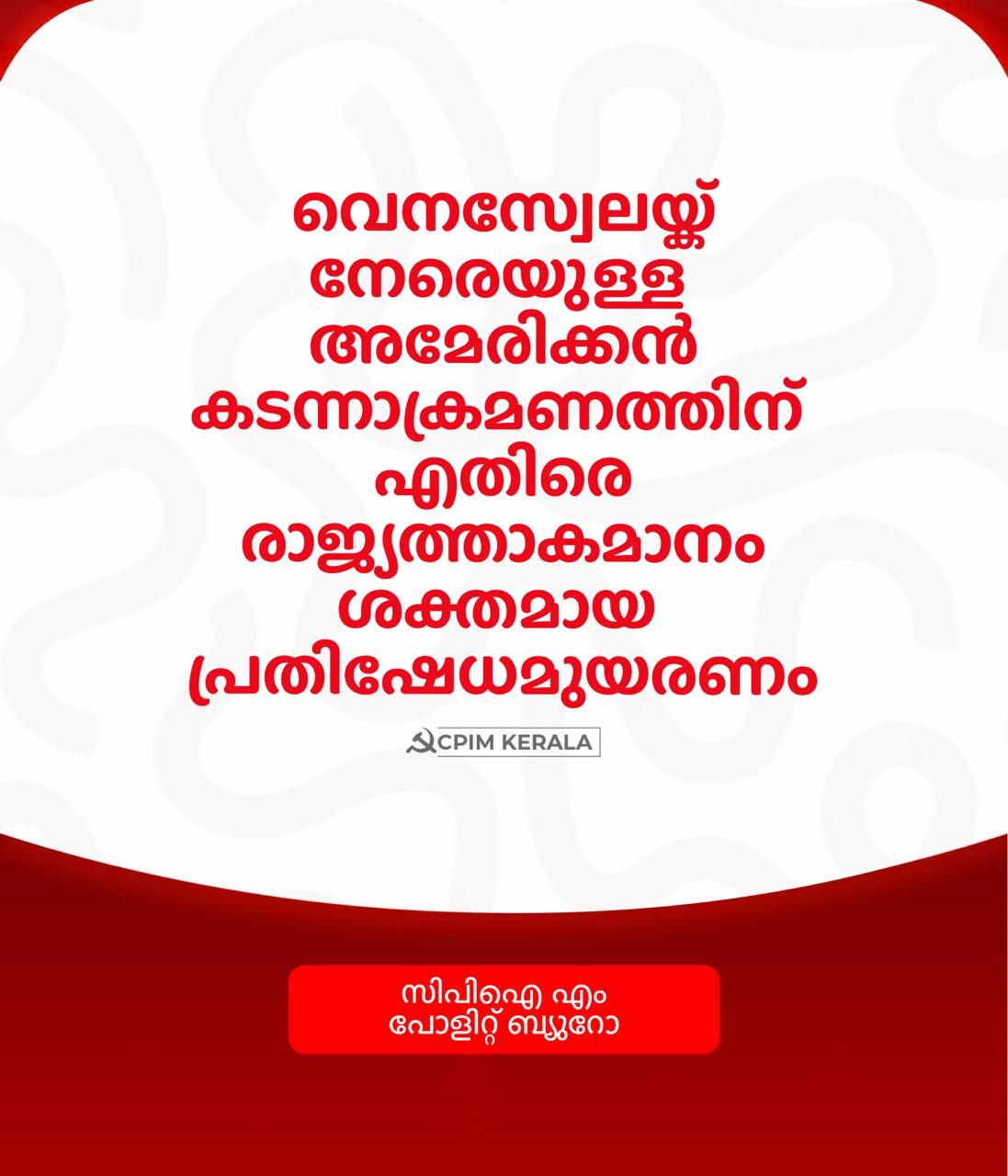 വെനസ്വേലയ്ക്ക് നേരെയുള്ള അമേരിക്കയുടെ കടന്നാക്രമണത്തിൽ ഇന്ത്യൻ ജനത ശക്തമായ പ്രതിഷേധമുയർത്തണം. യുഎൻ പ്രമാണങ്ങൾക്ക് അനുസൃതമായി പെരുമാറാൻ അമേരിക്ക തയാറാവണം. വെനസ്വേലയിലെ ജനവാസ കേന്ദ്രങ്ങളിലേക്കാണ് ബോംബാക്രമണം നടത്തിയിരിക്കുന്നത്. നാളുകളായി യുഎസിൻ്റെ ലക്ഷ്യമായിരുന്നു വെനസ്വേല. വെനസ്വേലയിൽ വ്യോമാക്രമണം തുടരുന്നതിന് പിന്നാലെ പ്രസിഡന്റ് നിക്കോളാസ് മഡൂറോയെയും ഭാര്യ സീലിയ ഫ്ളോറസിനെയും യുഎസ് സേന ബന്ദികളാക്കിയതായി അമേരിക്കന് പ്രസിഡന്റ് ഡോണാള്ഡ് ട്രംപ് വെളിപ്പെടുത്തിയത്. കാരക്കാസിലും തൊട്ടടുത്ത പ്രദേശങ്ങളിലും അമേരിക്ക നിരവധി വ്യോമോക്രമണങ്ങൾ നടത്തിയിരുന്നു. വ്യത്യസ്ത ഇടങ്ങളിൽ സ്ഫോടനം നടത്തിയതായി റോയിട്ടേഴ്സും റിപ്പോർട്ട് ചെയ്തു. കുറഞ്ഞത് ഏഴ് സ്ഫോടനങ്ങളാണ് കാരക്കാസിലും സമീപപ്രദേശങ്ങളിലും നടന്നത്. തുടര്ന്നാണിപ്പോള് മഡൂറോയെ ബന്ദിയാക്കിയതായുള്ള വാര്ത്തകള് പുറത്തുവരുന്നത്.