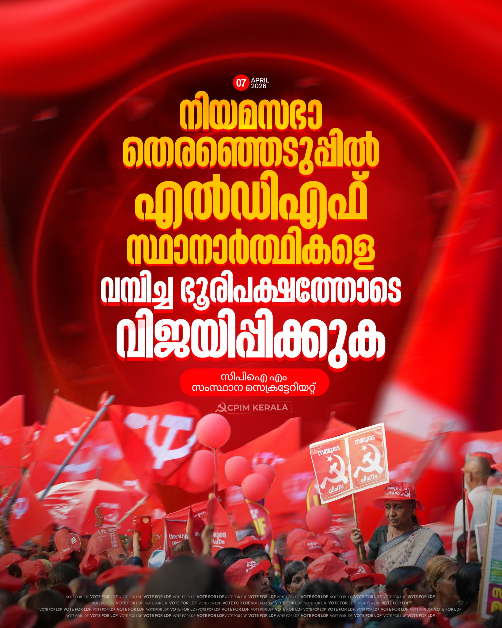 ഏപ്രില് 9-ന് നടക്കുന്ന നിയമസഭാ തെരഞ്ഞെടുപ്പില് എല്.ഡി.എഫ് സ്ഥാനാര്ത്ഥികളെ വമ്പിച്ച ഭൂരിപക്ഷത്തോടെ വിജയിപ്പിക്കുക. 2011-2016 കാലഘട്ടത്തില് കേരളം ഭരിച്ച യു.ഡി.എഫ് സര്ക്കാര് ആഗോളവല്ക്കരണ നയങ്ങള് അതേപോലെ നടപ്പിലാക്കാനാണ് ശ്രമിച്ചത്. അതിന്റെ ഫലമായി നാടിന്റെ സമസ്ത മേഖലകളും തകര്ന്നു. പാഠപുസ്തകങ്ങള് പോലും ലഭ്യമായില്ല, വര്ഗ്ഗീയ ധ്രുവീകരണം രൂപപ്പെട്ടു, പൊതുമേഖലാ സ്ഥാപനങ്ങള് പലതും അടച്ചുപൂട്ടി, കാര്ഷിക മേഖല തകര്ന്നു, ക്ഷേമ പെന്ഷനുകള് വര്ദ്ധിപ്പിച്ചില്ലെന്ന് മാത്രമല്ല, അവയെല്ലാം കുടിശ്ശികയാക്കി. ജീവനക്കാര്ക്ക് പോലും ശമ്പളം നല്കാന് കഴിയാത്തവിധം സാമ്പത്തിക തകര്ച്ചയും നേരിട്ടു.