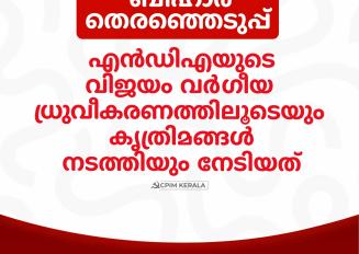 16/11/2025ബിജെപിയുടെ ജനവിരുദ്ധ നയങ്ങളെ പരാജയപ്പെടുത്താൻ പ്രതിപക്ഷ പാർടികൾ സംയുക്തമായി പോരാടണമെന്ന് ബിഹാർ തെരഞ്ഞെടുപ്പ് കാണിക്കുന്നു. ബിഹാർ നിയമസഭാ തെരഞ്ഞെടുപ്പിൽ 67 ശതമാനം വോട്ടർമാരാണ് ഇത്തവണയുണ്ടായിരുന്നത്. മുൻ തെരഞ്ഞെടുപ്പിനെ അപേക്ഷിച്ച് 9.6 ശതമാനം വർദ്ധനവ്.