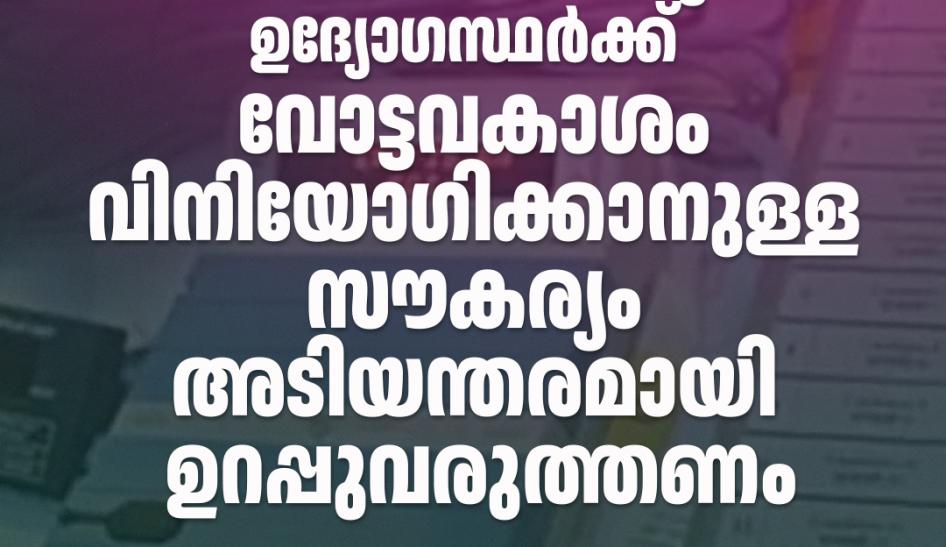 തെരഞ്ഞെടുപ്പ് ജോലിക്ക് നിയോഗിക്കപ്പെട്ട ഉദ്യോഗസ്ഥര്ക്ക് വോട്ടവകാശം വിനിയോഗിക്കാനുള്ള സൗകര്യം അടിയന്തരമായി ഉറപ്പുവരുത്തണം. തപാല് വോട്ടിന് തെരഞ്ഞെടുപ്പ് കമീഷന് ഏര്പ്പെടുത്തിയ പുതിയ ക്രമീകരണങ്ങള് വ്യാപക ആശയക്കുഴപ്പത്തിന് ഇടയാക്കുകയാണ്.