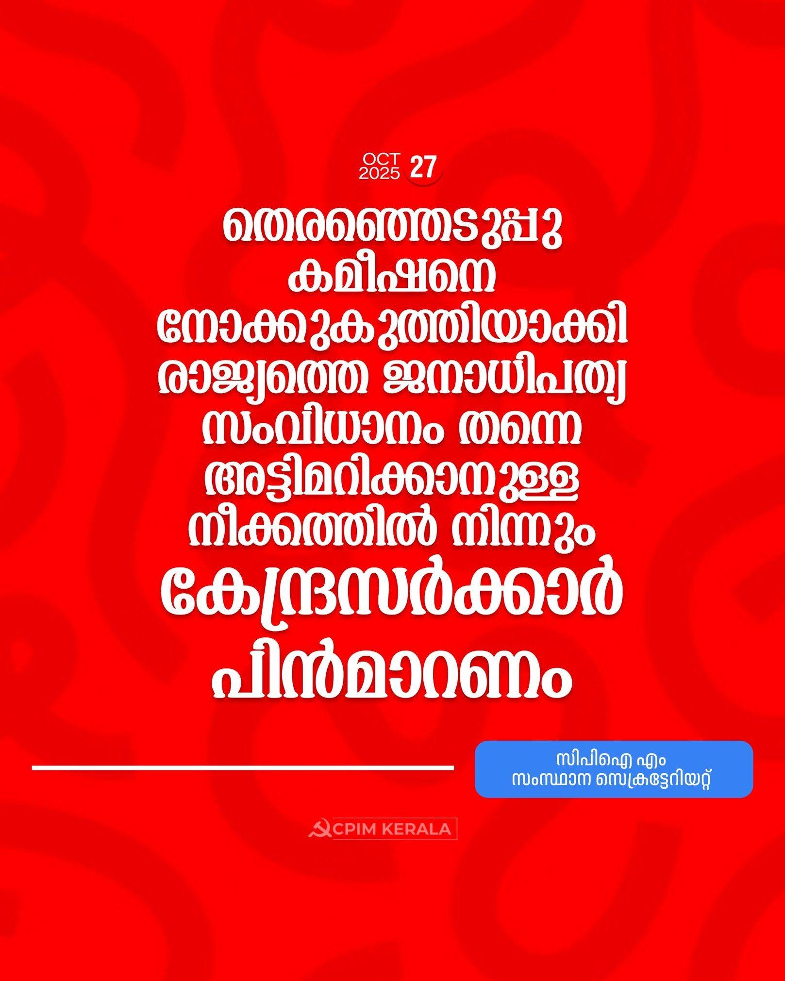 തെരഞ്ഞെടുപ്പു കമീഷനെ നോക്കുകുത്തിയാക്കി രാജ്യത്തെ ജനാധിപത്യ സംവിധാനം തന്നെ അട്ടിമറിക്കാനുള്ള നീക്കത്തില് നിന്നും കേന്ദ്രസര്ക്കാര് പിന്മാറണം. ബിഹാര് മോഡലിലുള്ള വോട്ടര്പട്ടികയുടെ തീവ്രപരിഷ്കരണം കേരളം ഉള്പ്പടെ രാജ്യമാകെ വ്യാപിപ്പിക്കാനുള്ള ശ്രമമാണ് തിടുക്കത്തില് ആരംഭിച്ചിട്ടുള്ളത്. കേരളത്തില് എസ്.ഐ.ആര് നടപ്പാക്കാനുള്ള നടപടി ക്രമങ്ങളിലേക്ക് കമീഷന് കടന്നുകഴിഞ്ഞു. അതിന്റെ ഭാഗമായി നിലവിലെ വോട്ടര്പട്ടിക മരവിപ്പിച്ചു. നവംബര് 4 മുതല് ഡിസംബര് 4 വരെ വിവരശേഖരണം നടത്തി ഡിസംബര് 9-ന് കരട് വോട്ടര്പട്ടിക പുറത്തുവിടാനാണ് കമീഷന്റെ തീരുമാനം. തദ്ദേശ തിരഞ്ഞെടുപ്പിനുശേഷം പരിഗണിക്കാമെന്ന അഭ്യര്ഥന തിരഞ്ഞെടുപ്പ് കമീഷണര് തള്ളിയിരിക്കുകയാണ്. തികച്ചും ജനാധിപത്യവിരുദ്ധമായ നീക്കമാണ് കമീഷന് ആരംഭിച്ചിട്ടുള്ളത്. കേരളത്തിലെ തദ്ദേശ സ്വയംഭരണ തിരഞ്ഞെടുപ്പിലെ വോട്ടര്പട്ടികയെ കുറിച്ച് ചോദിച്ചപ്പോള് വിജ്ഞാപനം ആയില്ലല്ലോ എന്ന മറുപടി ഏറെ ആശങ്ക ഉളവാക്കുന്നതാണ്.