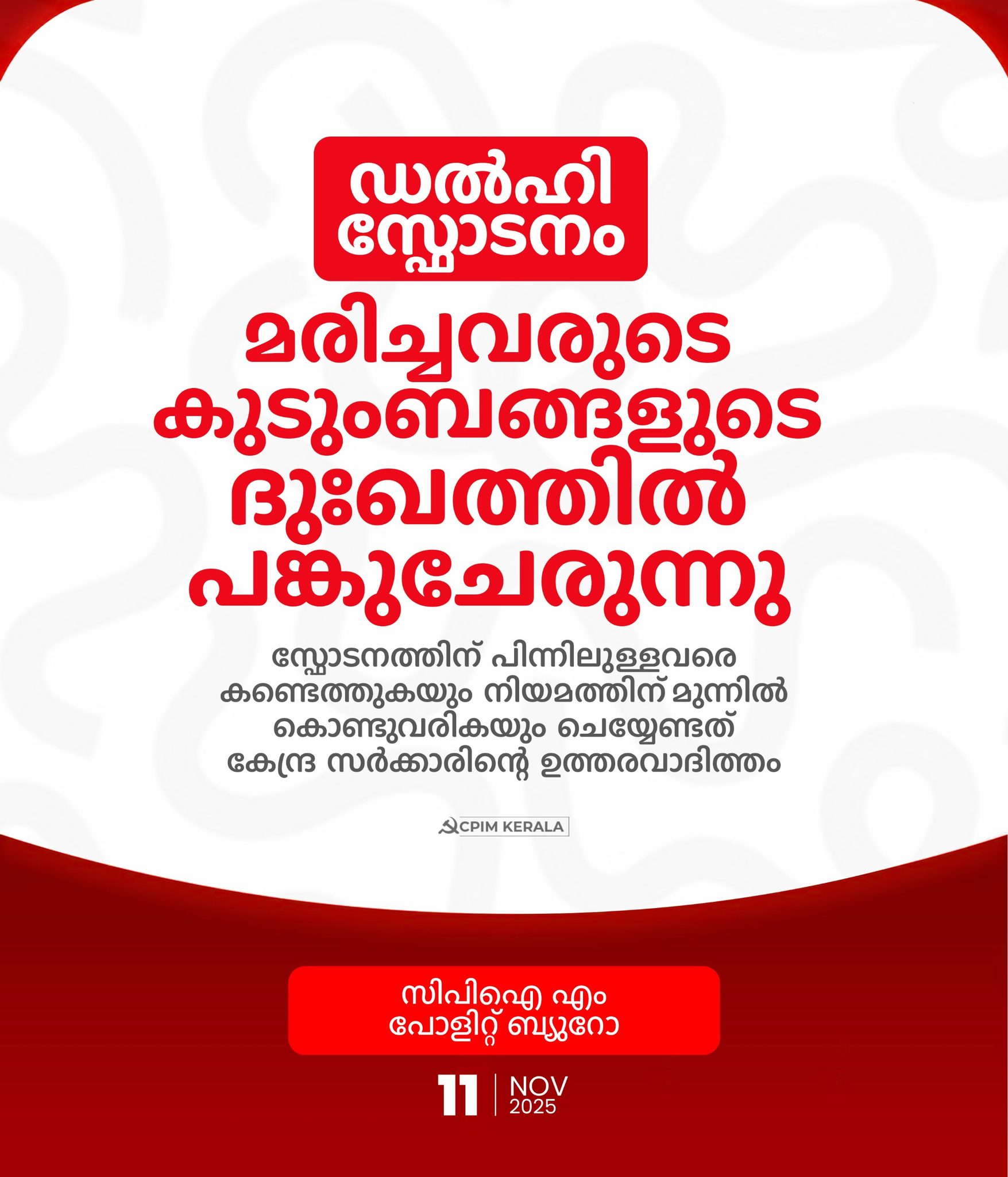 ഇന്നലെ (നവംബർ 10) രാത്രി ഡൽഹിയിലുണ്ടായ സ്ഫോടനത്തെ അപലപിക്കുന്നു. സ്ഫോടനത്തിൽ പ്രിയപ്പെട്ടവരെ നഷ്ടപ്പെട്ട കുടുംബങ്ങളുടെ ദുഃഖത്തിൽ പങ്കുചേരുന്നു. ഡൽഹിയുടെെ സമീപ പ്രദേശങ്ങളിൽ നിന്ന് വൻ തോതിൽ സ്ഫോടകവസ്തുക്കളും തോക്കുകളും കണ്ടെത്തിയെന്ന റിപ്പോർട്ട് വളരെയധികം അസ്വസ്ഥതയുണ്ടാക്കുന്നതാണ്. അവ ഡൽഹിയിലെ ആക്രമണവുമായും ബന്ധപ്പെട്ടിരിക്കുന്നുവെന്നാണ് വിവരം. ഇത് ഒരു സംഘടിത ശൃംഖലയുടെ പങ്കാളിത്തത്തെയാണ് സൂചിപ്പിക്കുന്നത്. സ്ഫോടനത്തിന് പിന്നിലുള്ളവരെ കണ്ടെത്തുകയും നിയമത്തിന് മുന്നിൽ കൊണ്ടുവരികയും ചെയ്യേണ്ടത് സർക്കാരിന്റെ ഉത്തരവാദിത്തമാണ്. ജനങ്ങൾ പ്രകോപനങ്ങളിൽ വീഴാതെ ജാഗ്രത പാലിക്കുകയും സമാധാനവും ഐക്യവും നിലനിർത്തുകയും വേണമെന്ന് അഭ്യർഥിക്കുന്നു.