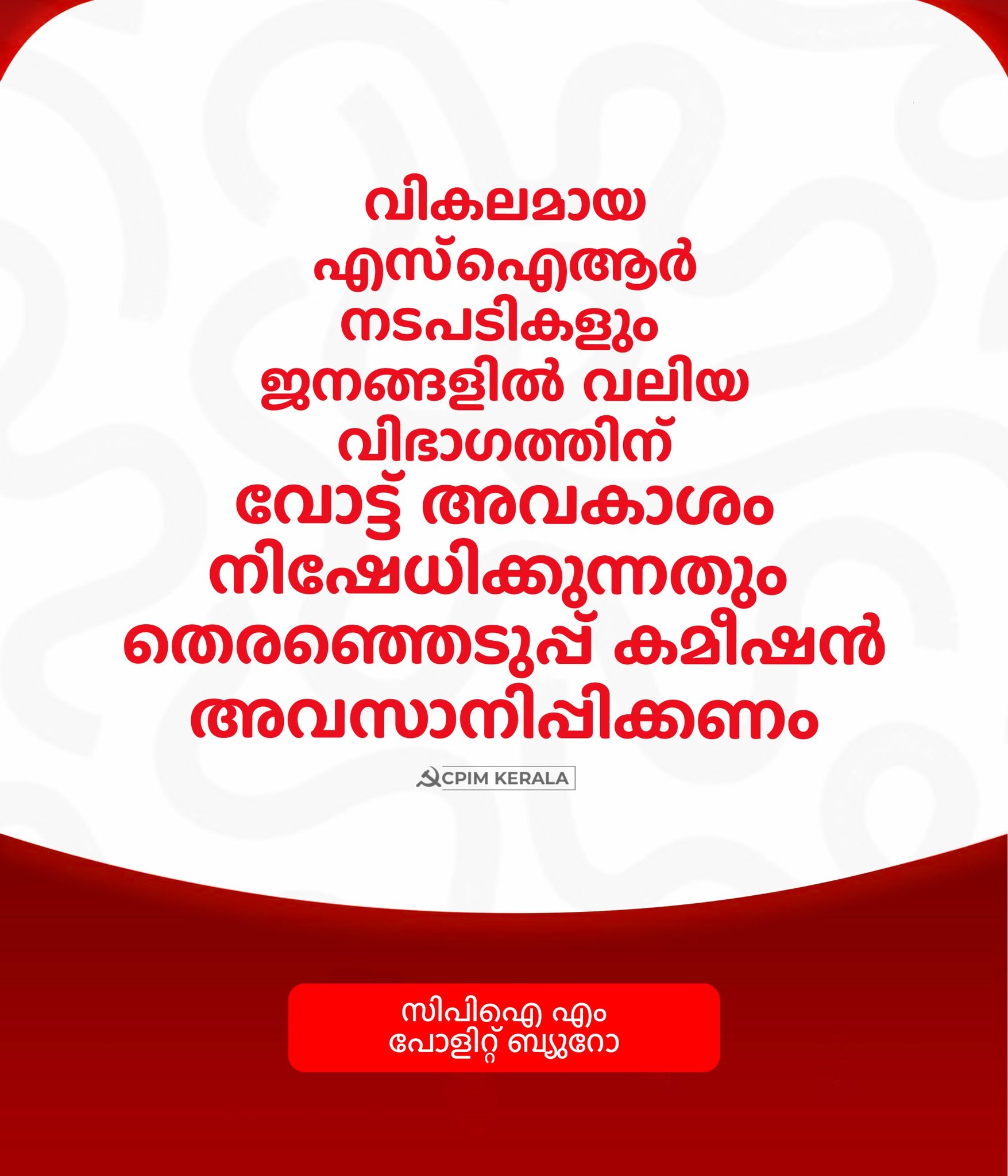 വികലമായ എസ്ഐആർ(വോട്ടർ പട്ടിക തീവ്ര പുനഃപരിശോധന) നടപടികളും ജനങ്ങളിൽ വലിയ വിഭാഗത്തിന് വോട്ട് അവകാശം നിഷേധിക്കുന്നതും തെരഞ്ഞെടുപ്പ് കമീഷൻ അവസാനിപ്പിക്കണം. പതിവുപോലെ സുതാര്യമായും ജനങ്ങളെ ബുദ്ധിമുട്ടിക്കാത്ത രീതിയിലും നടക്കേണ്ട വോട്ടർപട്ടിക പരിഷ്കരണം അരാജകത്വം നിറഞ്ഞതും ജനങ്ങളെയും ഇൗ ജോലി ഏറ്റെടുക്കാൻ നിർബന്ധിതരായ ഉദ്യോഗസ്ഥരെയും ഒരുപോലെ ഭീഷണിപ്പെടുത്തുന്നതുമായി മാറിയിരിക്കുന്നു.