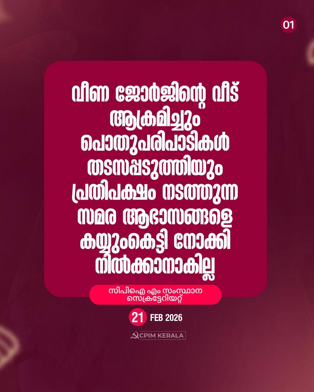 ആരോഗ്യ വകുപ്പ് മന്ത്രി വീണ ജോര്ജിന്റെ വീട് ആക്രമിച്ചും പൊതുപരിപാടികള് തടസപ്പടുത്തിയും പ്രതിപക്ഷം നടത്തുന്ന സമര ആഭാസങ്ങളെ കയ്യുംകെട്ടി നോക്കി നില്ക്കാനാകില്ല. മന്ത്രിയുടെ വീടിന്റെ ഗേറ്റ് തകര്ത്ത് വീട്ടില് കയറി റീത്ത് വച്ചു. പൊലീസ് വാഹനം തകര്ത്തു, പൊലീസുകാരെ അക്രമിച്ചു. നാടാകെ കലാപമുണ്ടാക്കാനുള്ള ശ്രമമാണ് ഇപ്പോള് നടക്കുന്നത്.
