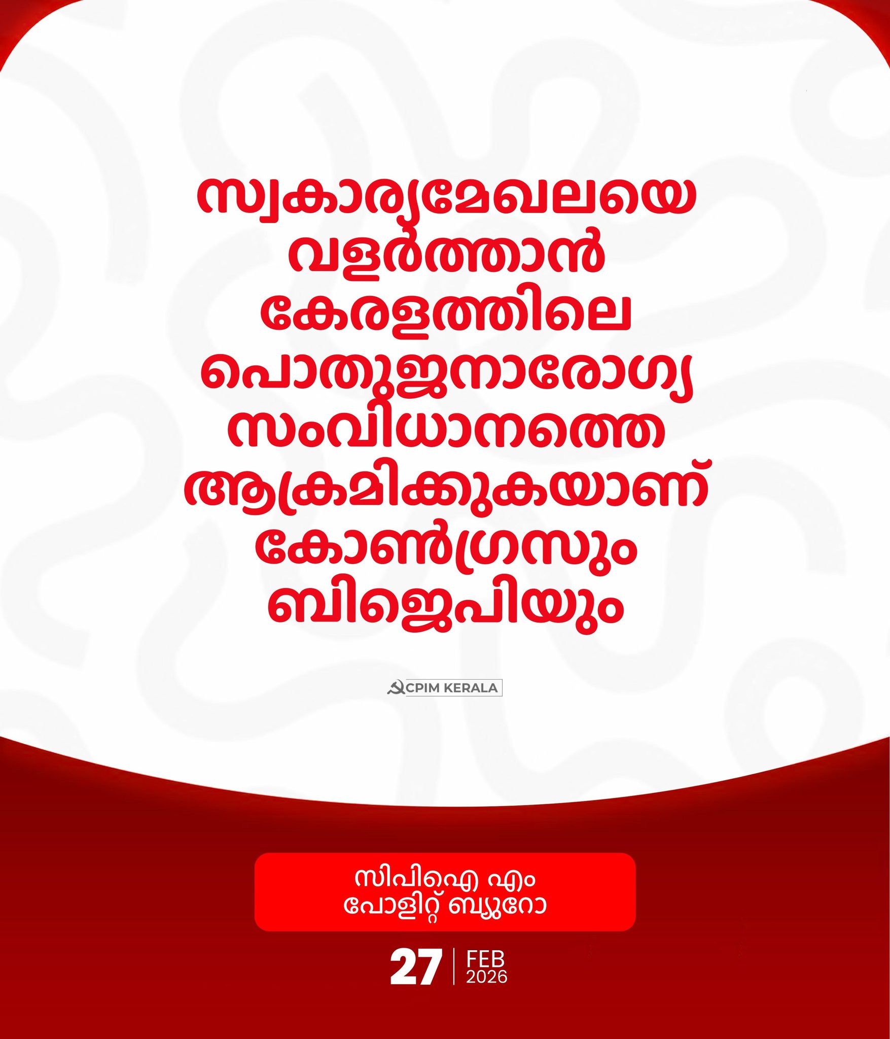 പൊതുജനാരോഗ്യത്തിൽ എൽഡിഎഫിന്റെ ഈ നേട്ടങ്ങൾ കോൺഗ്രസിനും ബിജെപിക്കും ഉൾക്കൊള്ളാൻ കഴിയുന്നില്ല. ആരോഗ്യം ഉൾപ്പെടെ എല്ലാ മേഖലകളിലും സ്വകാര്യ കമ്പനികളെ പ്രോത്സാഹിപ്പിക്കുക എന്നതാണ് അവരുടെ നയം. വലിയ നിക്ഷേപങ്ങൾ നടത്തിയിട്ടും സ്വകാര്യ മേഖലയ്ക്ക് കേരളത്തിലേക്ക് ആഴത്തിൽ കടന്നുചെല്ലാൻ കഴിയാത്തതിന്റെ പ്രധാന കാരണം ശക്തമായ ഒരു പൊതുമേഖലയുടെ സാന്നിധ്യമാണ്. സ്വകാര്യ മേഖലയെ വളർത്തുക എന്ന ലക്ഷ്യത്തോടെയാണ് കേരളത്തിലെ പൊതുജനാരോഗ്യ സംവിധാനത്തിനു നേരെ ആക്രമണങ്ങൾ നടത്തുന്നത്.