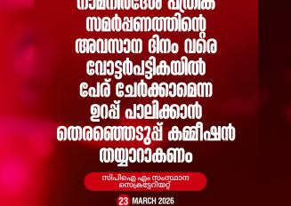 23/03/2026നാമനിര്ദേശ പത്രികാ സമര്പ്പണത്തിന്റെ അവസാന ദിവസം വരെ അപേക്ഷ നല്കി വോട്ടര്പട്ടികയില് പേര് ചേര്ക്കാമെന്ന ഉറപ്പ് പാലിക്കാന് തെരഞ്ഞെടുപ്പ് കമ്മീഷന് തയ്യാറാകണം.