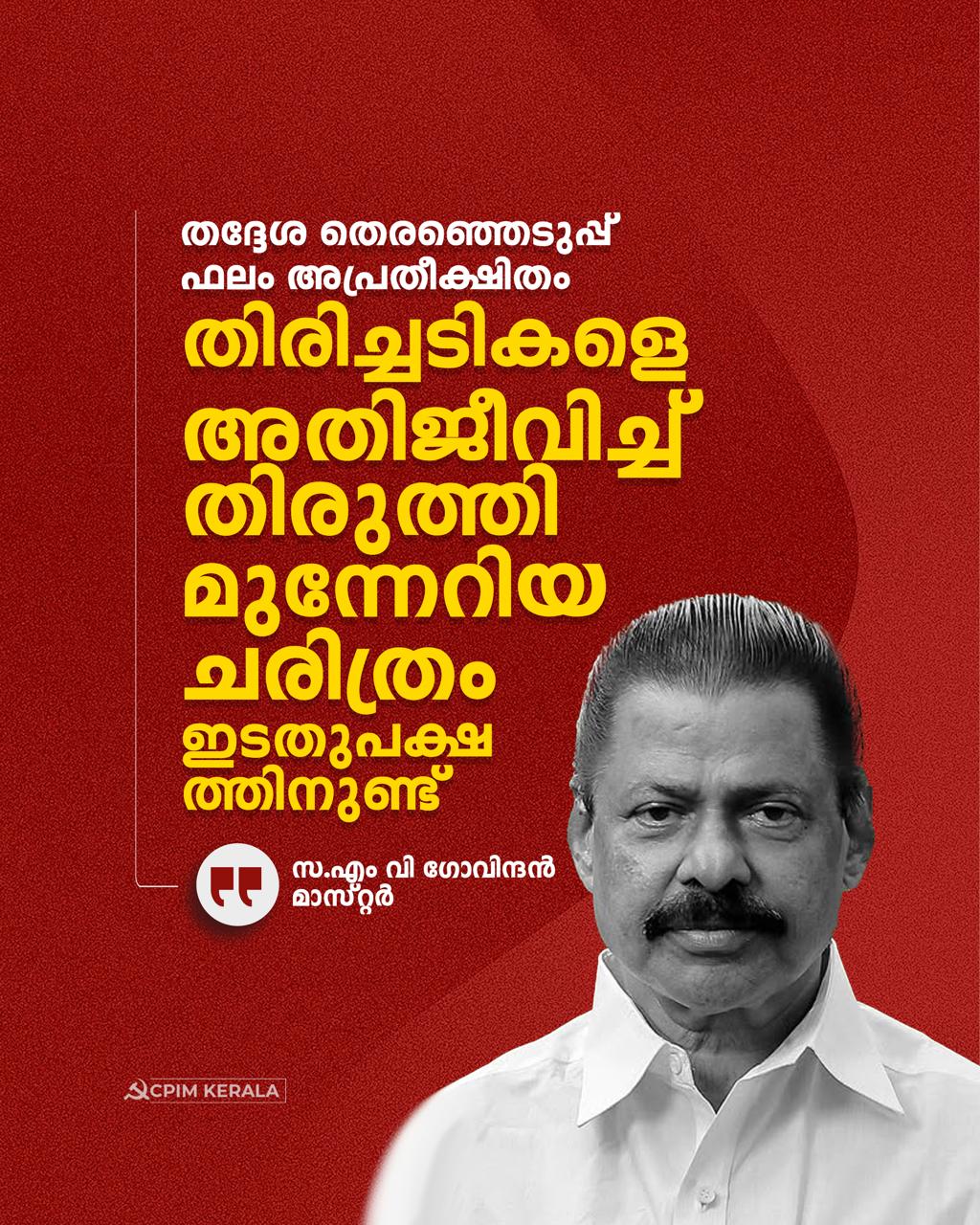 തദ്ദേശ തെരഞ്ഞെടുപ്പില് അപ്രതീക്ഷിത തിരിച്ചടികളാണ് ഉണ്ടായിരിക്കുത്. അവ പരിശോധിച്ച് ആവശ്യമായ തിരുത്തലുകൾ വരുത്തും. ഇതിനുമുമ്പും തിരുത്തലുകള് വരുത്തിക്കൊണ്ടാണ് തിരിച്ചടികളെ അതിജീവിച്ച് ജനങ്ങളുടെ വിശ്വാസമാര്ജ്ജിച്ച് എല്ഡിഎഫ് മുന്നോട്ടുപോയിട്ടുള്ളത്. എല്ഡിഎഫിന്റെ അടിത്തറയാകെ തകര്ന്നുപോയിരിക്കുന്നുവെന്ന തരത്തിൽ പ്രചരണം നടത്തുന്നതിൽ കാര്യമില്ല. തിരിച്ചടികളെ ശരിയായ രീതിയില് പരിശോധിച്ച് മുന്നോട്ടുപോയതുകൊണ്ടാണ് പാര്ലമെന്റില് ഒരു സീറ്റ് ലഭിച്ച തെരഞ്ഞെടുപ്പിന് ശേഷം നടന്ന അസംബ്ലി തെരഞ്ഞെടുപ്പില് പാര്ട്ടിക്ക് 98 സീറ്റ് ലഭിച്ചത്. അതുകൊണ്ട് പ്രചരണം നടത്തുന്ന ആളുകള് ഇത്തരമൊരു ചരിത്രം കൂടി ഓര്ക്കേണ്ടതുണ്ട്.