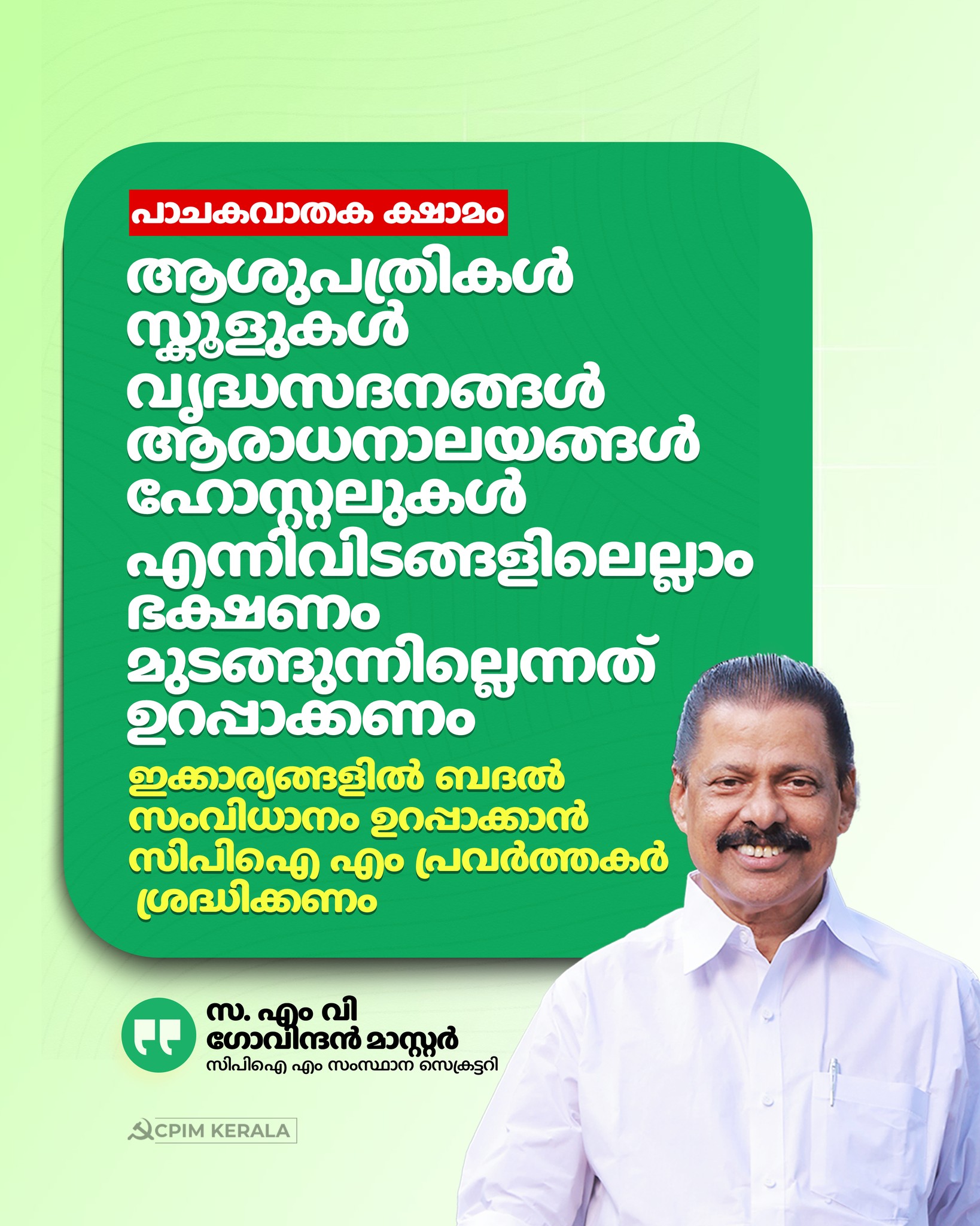 പാചകവാതക ക്ഷാമം: ആശുപതികൾ, സ്കൂളുകൾ, വൃദ്ധസദനങ്ങൾ, ആരാധനാലയങ്ങൾ, ഹോസ്റ്റലുകൾ എന്നിവിടങ്ങളിലെല്ലാം ഭക്ഷണം മുടങ്ങുന്നില്ലെന്നത് ഉറപ്പാക്കണം. ഇക്കാര്യങ്ങളിൽ ബദൽ സംവിധാനം ഉറപ്പാക്കാൻ സിപിഐ എം പ്രവർത്തകർ ശ്രദ്ധിക്കണം.