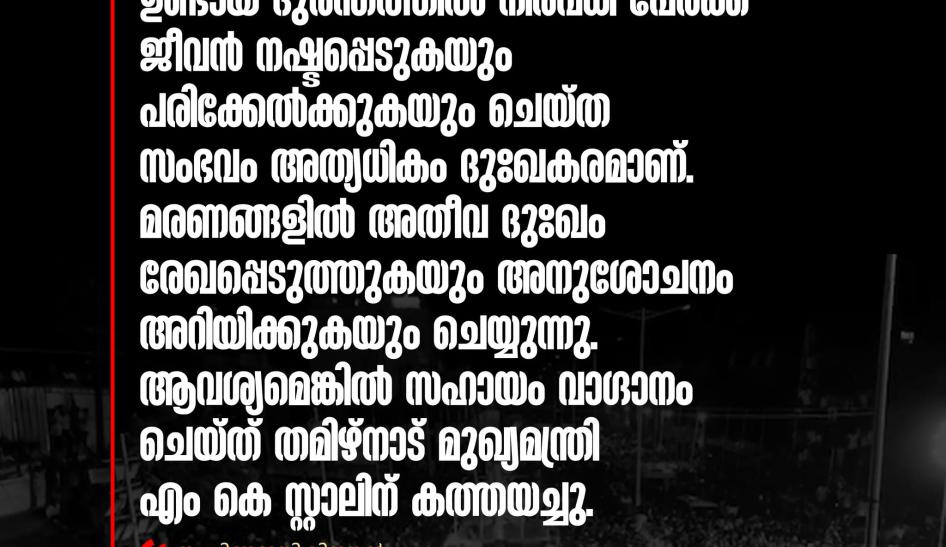 കരൂരിൽ തമിഴക വെട്രി കഴകത്തിന്റെ റാലിക്കിടെയുണ്ടായ അപകടത്തിൽ നിരവധി പേർക്ക് ജീവൻ നഷ്ടപ്പെടുകയും പരിക്കേൽക്കുകയും ചെയ്ത സംഭവം അത്യധികം വേദനാജനകമാണ്. മരണങ്ങളിൽ അനുശോചനം അറിയിക്കുകയും മരിച്ചവരുടെ കുടുംബങ്ങളുടെ ദുഃഖത്തിൽ പങ്കുചേരുകയും ചെയ്യുന്നു.