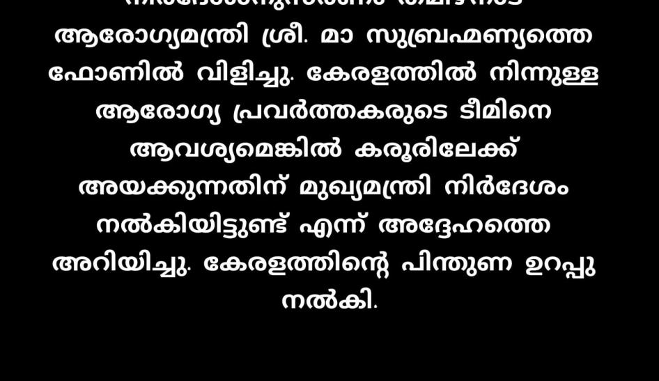 തമിഴ്നാട്ടിൽ ഉണ്ടായ ദുരന്തത്തിൽ മുഖ്യമന്ത്രി സ. പിണറായി വിജയന്റെ നിർദേശാനുസരണം തമിഴ്നാട് ആരോഗ്യമന്ത്രി ശ്രീ. മാ സുബ്രഹ്മണ്യത്തെ ഫോണിൽ വിളിച്ചു. കേരളത്തിൽ നിന്നുള്ള ആരോഗ്യ പ്രവർത്തകരുടെ ടീമിനെ ആവശ്യമെങ്കിൽ കരൂരിലേക്ക് അയക്കുന്നതിന് മുഖ്യമന്ത്രി നിർദേശം നൽകിയിട്ടുണ്ട് എന്ന് അദ്ദേഹത്തെ അറിയിച്ചു.
