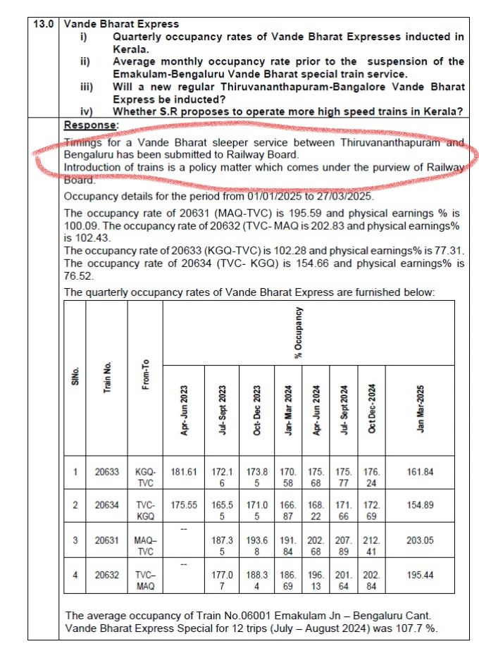 ഇതിനേക്കാളേറെ പ്രാധാനപ്പെട്ട് മറ്റൊരു കാര്യം. വന്ദേഭാരതിന്റെ പുതിയ പതിപ്പായ വന്ദേഭാരത് സ്ലീപ്പർ തിരുവനന്തപുരത്തിനും ബെംഗളൂരുവിനും ഇടയിൽ തുടങ്ങാൻ എല്ലാ നടപടിക്രമങ്ങളും ദക്ഷിണ റെയിൽവേ പൂർത്തിയാക്കിയിരുന്നു. സർവീസിന്റെ സമയം പോലും അവർ നിശ്ചയിച്ചിരുന്നു. ഇത്തരമൊരു സർവീസ് വന്നിരുന്നുവെങ്കിൽ രണ്ടു വന്ദേഭാരതത്തിന്റെ പ്രയോജനം ഒരു റൂട്ടിലുള്ള സർവീസുകൊണ്ട് നമുക്ക് ലഭിക്കുകയായിരുന്നു. ഇനി ഇത് ആര് പറഞ്ഞു എന്ന് ചിലർ ചോദിച്ചേക്കാം… കഴിഞ്ഞ മെയ് മാസത്തിൽ തിരുവനന്തപുരത്ത് ദക്ഷിണ റെയിൽവേ ജനറൽ മാനേജർ വിളിച്ചുചേർത്ത എംപിമാരുടെ യോഗത്തിൽ ഈയുള്ളവൻ നിർദ്ദേശിച്ച കാര്യങ്ങൾക്ക് ഔദ്യോഗികമായി നൽകിയ മറുപടിയാണ് ഇതെല്ലാം. (രേഖ ഇതോടൊപ്പം)