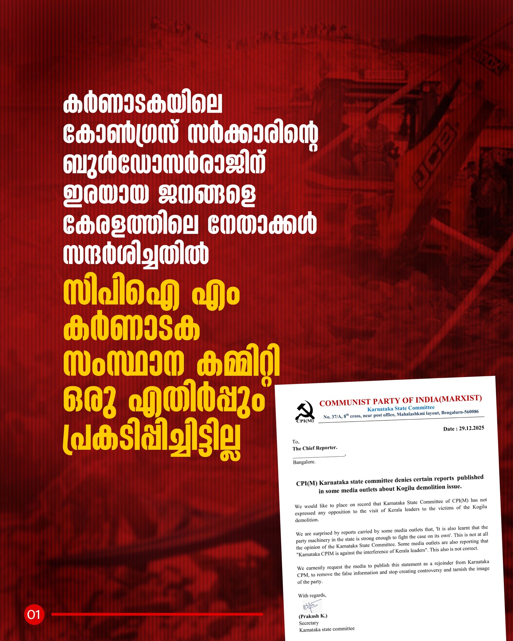 കർണാടകയിലെ കോൺഗ്രസ് സർക്കാരിന്റെ ബുൾഡോസർരാജിന് ഇരയായ ജനങ്ങളെ കേരളത്തിലെ സിപിഐ എം നേതാക്കൾ സന്ദർശിച്ചതുമായി ബന്ധപ്പെട്ട് ചില മാധ്യമങ്ങൾ നൽകിയ വ്യാജ വാർത്തയ്ക്ക് എതിരായി സിപിഐ എം കർണാടക സംസ്ഥാന കമ്മിറ്റി പത്രകുറിപ്പ് ഇറക്കി. കർണാടകയിൽ ബുൾഡോസർരാജിന് ഇരയായ ജനങ്ങളെ കേരളത്തിലെ നേതാക്കൾ സന്ദർശിച്ചതിൽ സിപിഐ എം കർണാടക സംസ്ഥാന കമ്മിറ്റി ഒരു എതിർപ്പും പ്രകടിപ്പിച്ചിട്ടില്ലെന്നും ഈ വിഷയവുമായി ബന്ധപ്പെട്ട് ചില മാധ്യമങ്ങൾ പ്രസിദ്ധീകരിച്ച വർത്തകൾ നിഷേധിക്കുന്നതായും പത്രകുറിപ്പിൽ പറയുന്നു. ചില മാധ്യമങ്ങൾ പ്രസിദ്ധീകരിച്ച വ്യാജ റിപ്പോർട്ടുകൾ അത്ഭുതപ്പെടുത്തുന്നതാണെന്നും വിവാദങ്ങൾ സൃഷ്ടിക്കാനും പാർടിയുടെ പ്രതിച്ഛായ കളങ്കപ്പെടുത്താനുമുള്ള ഇത്തരം ശ്രമങ്ങൾ അവസാനിപ്പിക്കണമെന്നും സിപിഐ എം കർണാടക സംസ്ഥാന കമ്മിറ്റി പറഞ്ഞു. മാധ്യമങ്ങൾ നൽകിയ തെറ്റായ വിവരങ്ങൾ നീക്കം ചെയ്യണമെന്നും സിപിഐ എം കർണാടക സംസ്ഥാന കമ്മിറ്റി പ്രസ്താവനയിലൂടെ ആവശ്യപ്പെട്ടു.