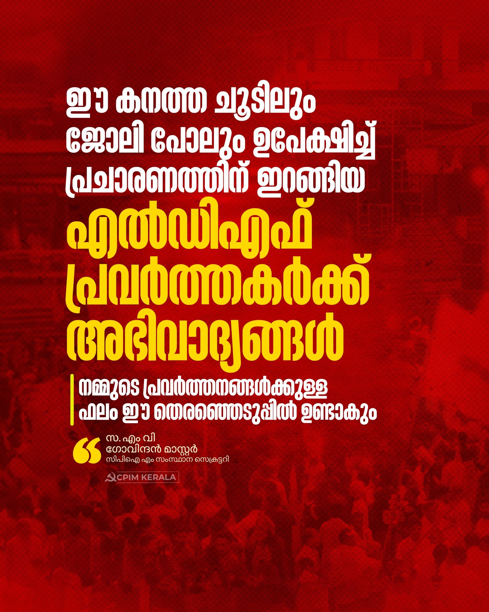 എൽഡിഎഫ് മികച്ച രാഷ്ട്രീയ പോരാട്ടം കാഴ്ചവെച്ചു. ഈ കനത്ത ചൂടിലും സ്വന്തം തൊഴിൽ പോലും ഉപേക്ഷിച്ച് പ്രചാരണത്തിന് ഇറങ്ങിയ എൽഡിഎഫ് പ്രവർത്തകർക്ക് അഭിവാദ്യങ്ങൾ. നമ്മുടെ പ്രവർത്തനങ്ങൾക്കുള്ള ഫലം ഈ തെരഞ്ഞെടുപ്പിൽ ഉണ്ടാകും.