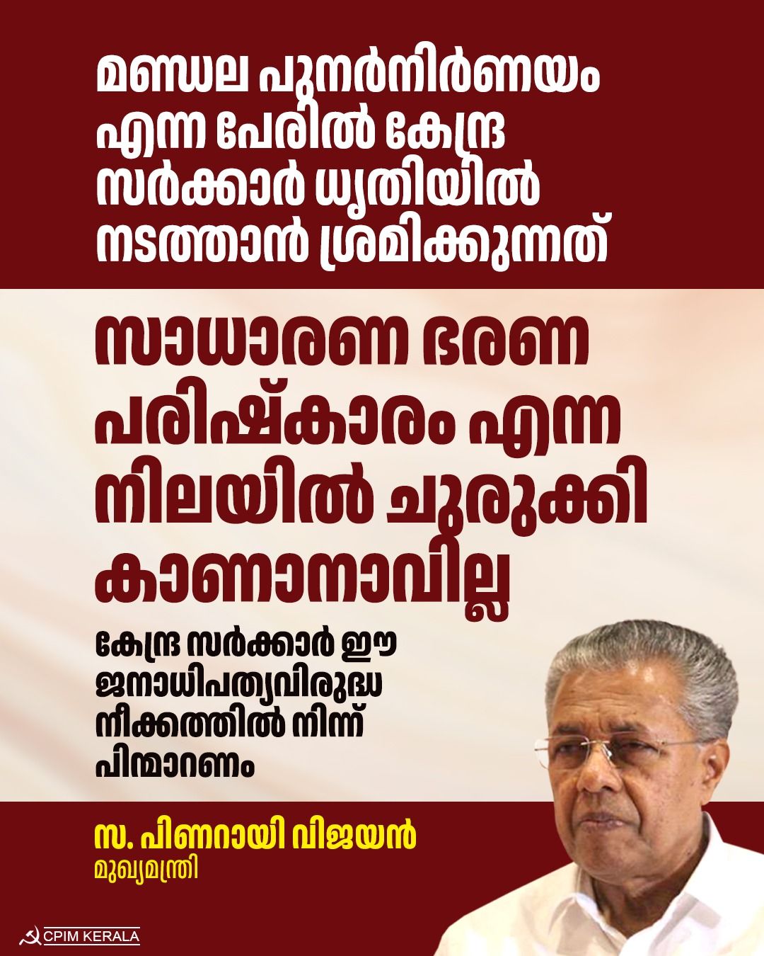 മണ്ഡല പുനർനിർണയം എന്ന പേരിൽ കേന്ദ്ര സർക്കാർ ധൃതിയിൽ നടത്താൻ ശ്രമിക്കുന്നത് സാധാരണ ഭരണപരിഷ്കാരം എന്ന നിലയിൽ ചുരുക്കി കാണാനാവില്ല. അത് രാജ്യത്തിന്റെ ഫെഡറൽ സംവിധാനത്തെ തന്നെ അട്ടിമറിക്കാനുള്ള നീക്കമാണ് എന്ന ഗുരുതരമായ സംശയമാണ് ഉയർന്നിട്ടുള്ളത്. പാർലമെന്റിന്റെ പ്രത്യേക സമ്മേളനത്തിൽ അവതരിപ്പിക്കപ്പെടുന്ന ബില്ലും 2011 ലെ സെൻസസ് അടിസ്ഥാനമാക്കി മുന്നോട്ടുവെക്കുന്ന അതിലെ നിർദ്ദേശങ്ങളും സംസ്ഥാനങ്ങളുടെ അവകാശങ്ങളെയും തുല്യനീതിയേയും സാരമായി ബാധിക്കുന്നതാണ്. സംസ്ഥാനങ്ങളുമായി സമവായത്തിൽ എത്താതെയാണ് ഇത്തരം നിർണായക വിഷയത്തിൽ കേന്ദ്രം മുന്നോട്ട് പോകുന്നത് എന്നതുതന്നെ ആശങ്കാജനകമാണ്.
