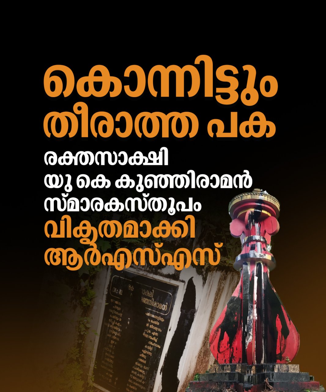 സഖാവ് യു കെ കുഞ്ഞിരാമൻ അന്ത്യവിശ്രമംകൊള്ളുന്ന രക്തസാക്ഷി സ്മൃതി കുടീരത്തിനുനേരെ ആർഎസ്എസ് അക്രമം. നീർവേലി ആയിത്തര റോഡരികിലെ രക്തസാക്ഷിസ്തൂപമാണ് ആയുധങ്ങൾ ഉപയോഗിച്ച് ഇടിച്ചുതകർക്കുകയും കരി ഓയിലൊഴിച്ച് വികൃതമാക്കുകയും ചെയ്തത്. സമീപത്തുള്ള കൊടിമരവും നശിപ്പിച്ചു. സമാധാനം നിലനിൽക്കുന്ന പ്രദേശമാണ് നീർവേലി. സംഭവത്തെ തുടർന്ന് സിപിഐ എം മെരുവമ്പായി ലോക്കൽ കമ്മിറ്റി കൂത്തുപറമ്പ് പൊലീസിൽ പരാതി നൽകി.