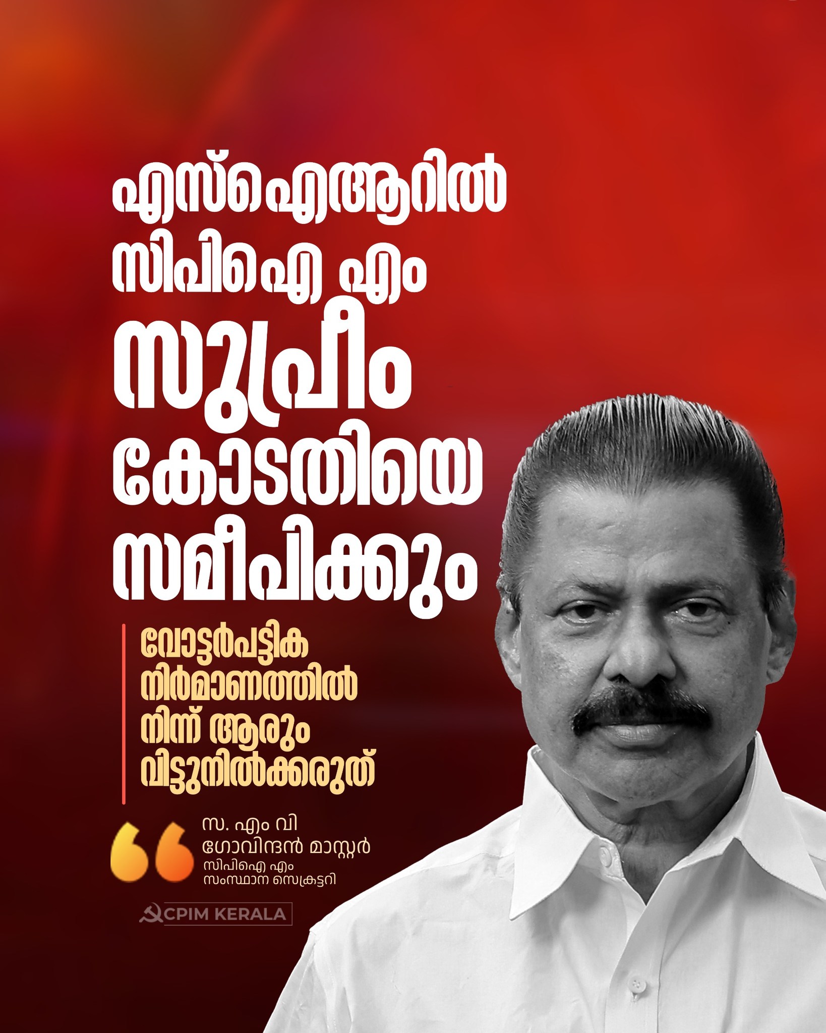 ഈ പശ്ചാത്തലത്തിൽ വോട്ടർപട്ടിക പുതുക്കുന്ന പ്രക്രിയയിൽനിന്ന് ഒരാളും ഒഴിഞ്ഞുനിൽക്കാതെ ഇടപെടേണ്ടതുണ്ട്. എസ്ഐആറിൽ നിയമപോരാട്ടം നടക്കുന്നു എന്നതുകൊണ്ട് വോട്ടർപട്ടിക നിർമാണത്തിൽനിന്ന് വിട്ടുനിന്നാൽ വലിയതോതിലുള്ള വോട്ടുചോർച്ചയുണ്ടായേക്കാം. വോട്ടർമാരെ ചേർക്കുന്നതിനും ഫോം പൂരിപ്പിക്കുന്നതിനും എല്ലാ പാർടികളും ഫലപ്രദമായി ഇടപെടണം.