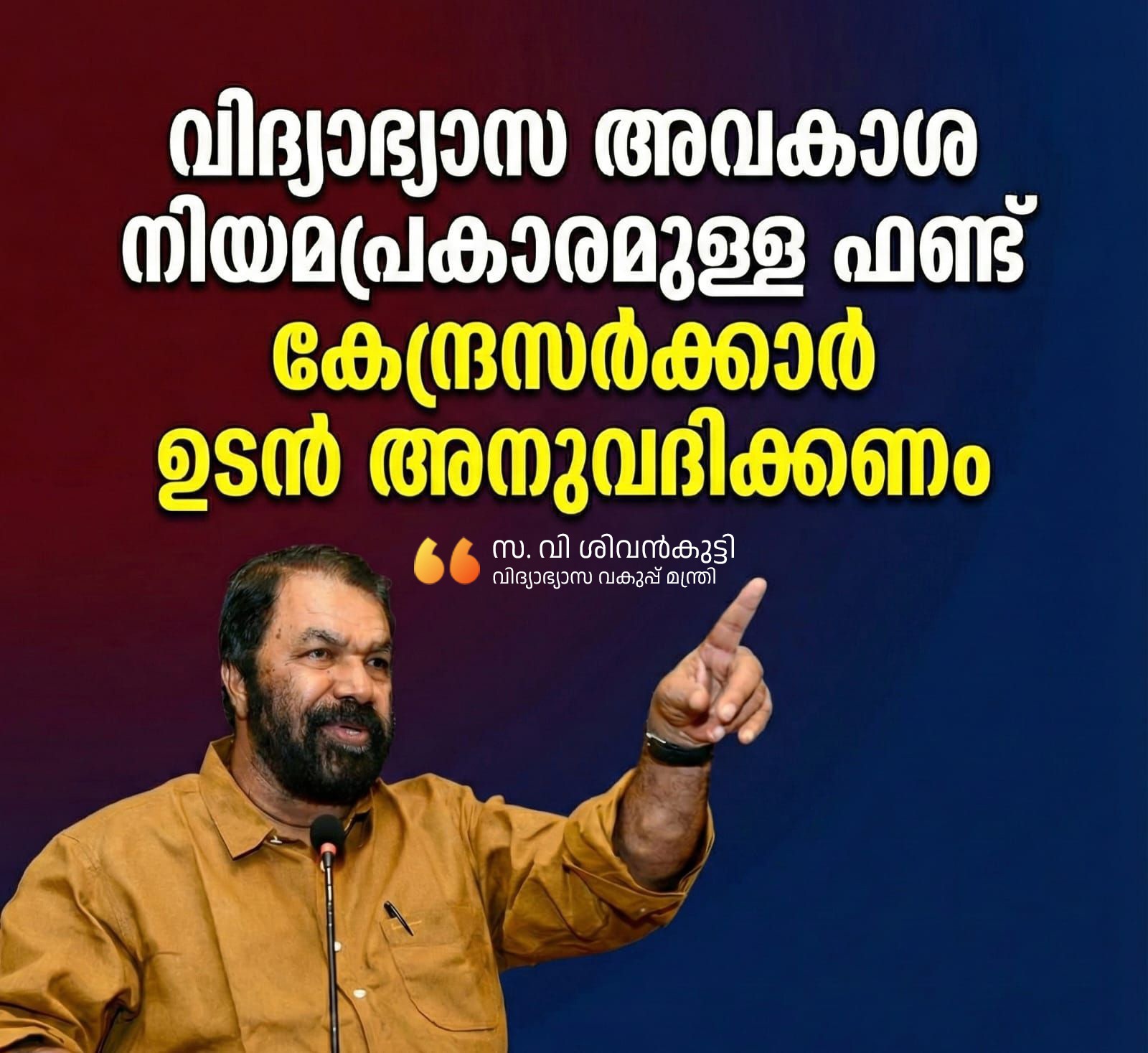 വിദ്യാഭ്യാസ അവകാശ നിയമം അനുസരിച്ചുള്ള ഫണ്ടും ഭിന്നശേഷി വിദ്യാർത്ഥികൾക്കുള്ള ഫണ്ടും അടിയന്തരമായി അനുവദിക്കാൻ കേന്ദ്രത്തിന് പ്രൊപ്പോസൽ നൽകിയിട്ടുണ്ട്. 2023-24 മുതൽ ഈ ഇനത്തിൽ മാത്രം 440.87 കോടി രൂപ കേരളത്തിന് ലഭിക്കാനുണ്ട്. 2023-24 വർഷത്തെ മൂന്നാം ഗഡു മുതൽ 2025-26 ഉൾപ്പെടെ ആകെ 1158 കോടി രൂപയാണ് സംസ്ഥാനത്തിന് മൊത്തത്തിൽ കേന്ദ്രത്തിൽ നിന്നും ലഭിക്കാനുള്ളത്.