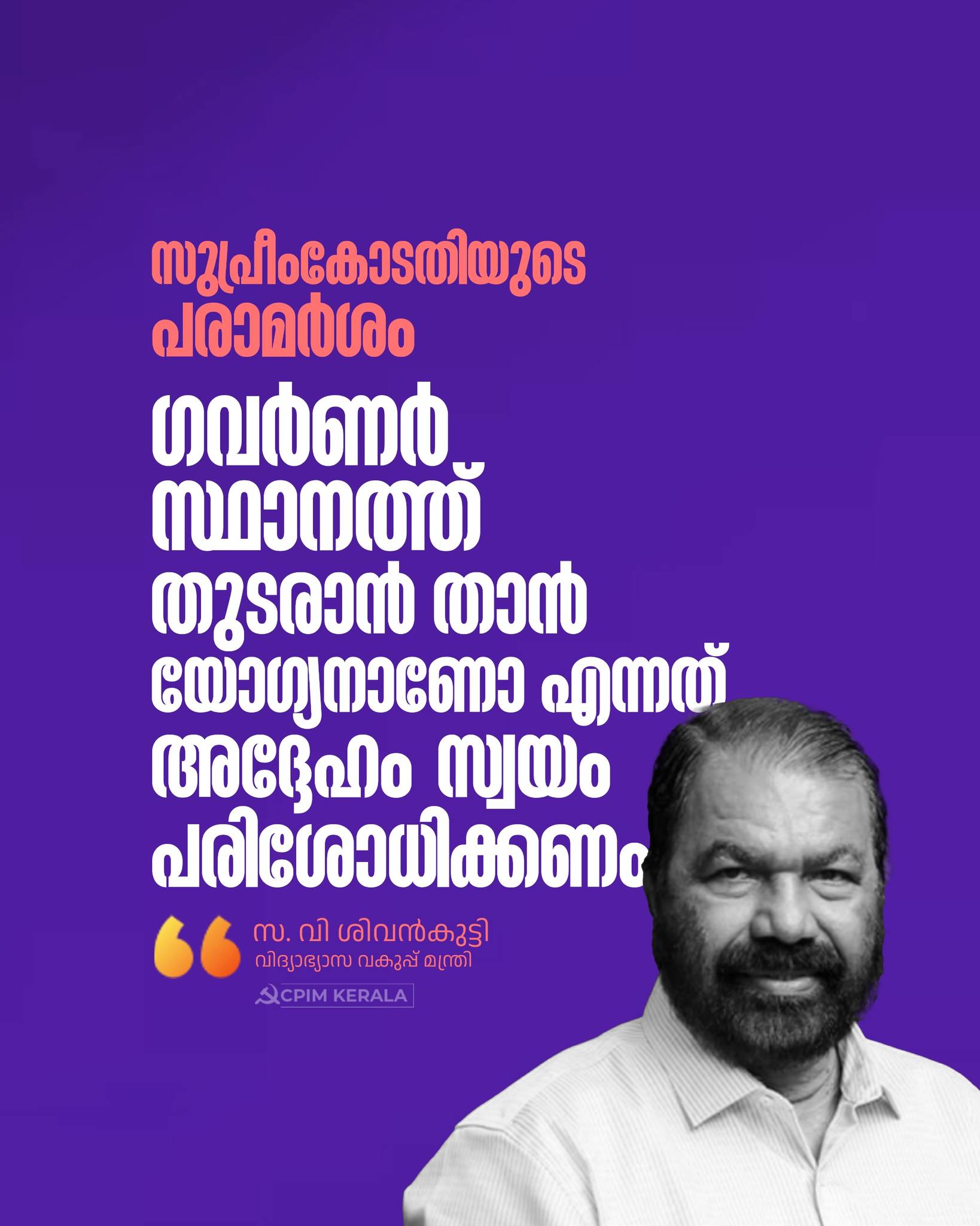 സംസ്ഥാനത്തെ ഡിജിറ്റൽ, സാങ്കേതിക സർവകലാശാലകളിൽ വൈസ് ചാൻസലർ നിയമനം വൈകുന്നതുമായി ബന്ധപ്പെട്ട് സുപ്രീംകോടതിയിൽ നിന്നുണ്ടായ പരാമർശത്തിന്റെ പശ്ചാത്തലത്തിൽ, ആ സ്ഥാനത്ത് തുടരാൻ താൻ യോഗ്യനാണോ എന്ന കാര്യം ഗവർണർ സ്വയം പരിശോധിക്കേണ്ടതുണ്ട്.