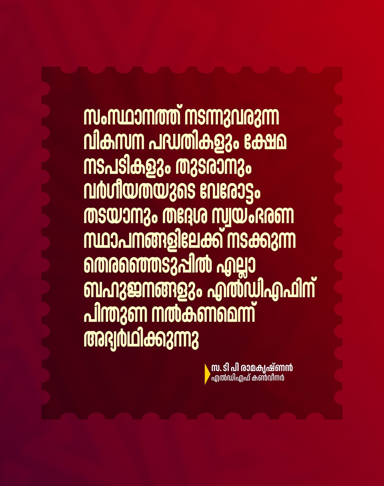 സംസ്ഥാനത്ത് നടന്നുവരുന്ന വികസന പദ്ധതികളും ക്ഷേമ നടപടികളും തുടരാനും വർഗീയതയുടെ വേരോട്ടം തടയാനും തദ്ദേശ സ്വയംഭരണ സ്ഥാപനങ്ങളിലേക്ക് നടക്കുന്ന തെരഞ്ഞെടുപ്പിൽ എല്ലാ ബഹുജനങ്ങളും പിന്തുണ നൽകണമെന്ന് അഭ്യർഥിക്കുന്നു. കേരളത്തിന്റെ ചരിത്രത്തിൽ കാണാത്തത്ര വിധമാണ് വികസനം നടന്നത്. ക്ഷേമ പെൻഷനടക്കം എല്ലാ ആനുകൂല്യങ്ങളും വർധിപ്പിച്ചു. കാലാനുസൃതമായി ഇനിയും അതിൽ വർധനകളുണ്ടാവണം.