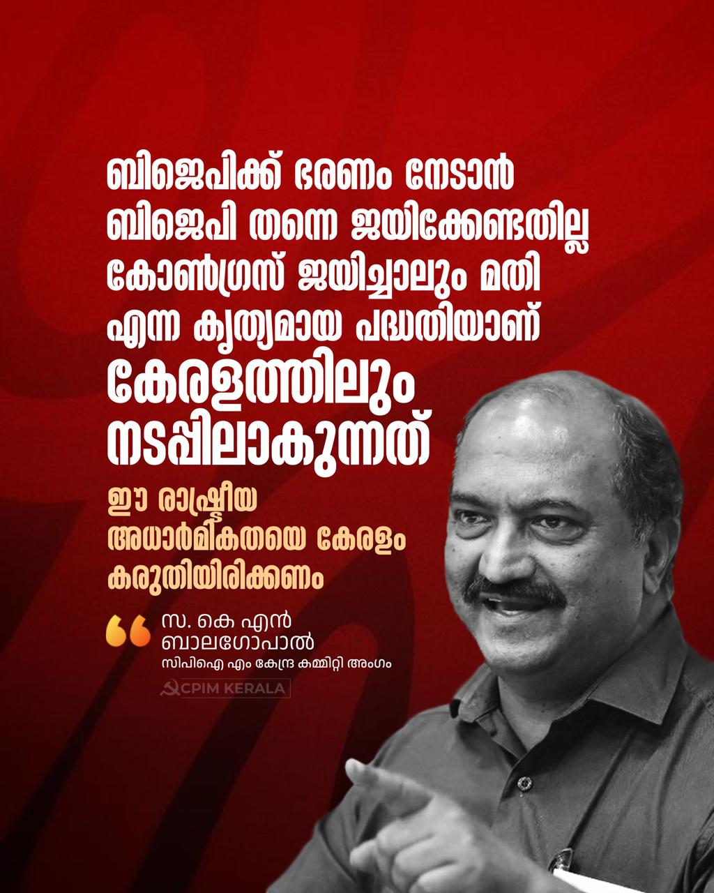 ബിജെപിക്ക് ഭരണം നേടാൻ ബിജെപി തന്നെ ജയിക്കേണ്ടതില്ല കോൺഗ്രസ് ജയിച്ചാലും മതി എന്ന കൃത്യമായ പദ്ധതിയാണ് നടപ്പിലാകുന്നത്. ഇത് സംസ്ഥാനമൊട്ടാകെ വ്യാപിപ്പിക്കാൻ ബിജെപി തയ്യാറെടുക്കുന്നു എന്നാണ് അറിയുന്നത്. ഈ രാഷ്ട്രീയ അധാർമികതയെ കേരളം കരുതിയിരിക്കണം.