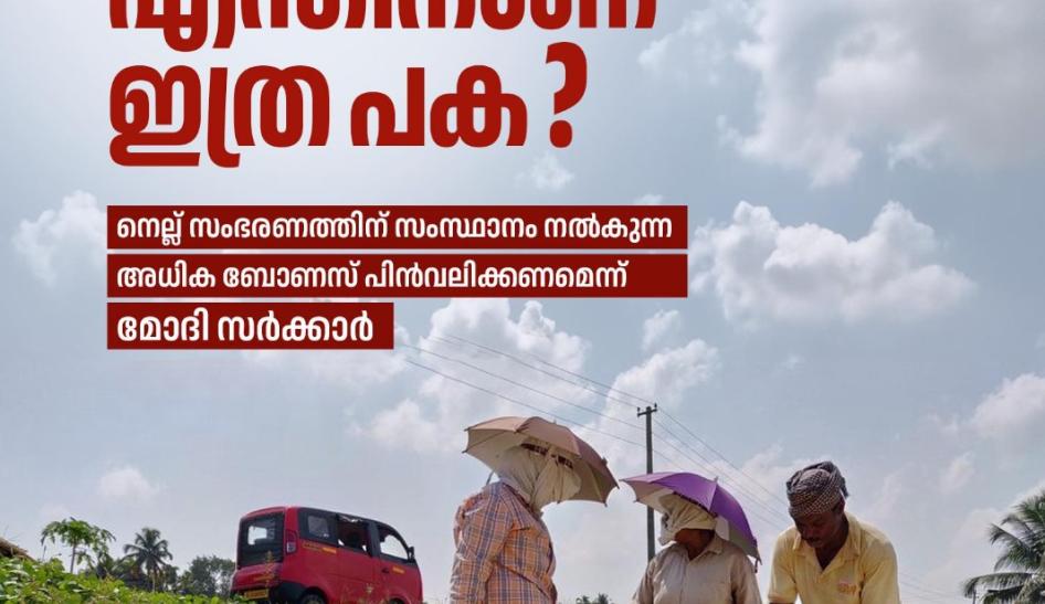 സംസ്ഥാന സര്ക്കാര് നെല്ല് സംഭരണത്തിനായി കിലോക്ക് 6.31 രൂപയാണ് അധികമായി നല്കുന്നത്. കേന്ദ്ര സര്ക്കാര് നല്കുന്ന തുകയാവട്ടെ സമയത്തിന് ലഭിക്കാത്ത സ്ഥിതിയും പ്രതിസന്ധി സൃഷ്ടിക്കുന്നുണ്ട്. ഈ സാഹചര്യത്തിലാണ് സംസ്ഥാന സര്ക്കാര് നല്കുന്ന തുക പിന്വലിക്കണമെന്ന കേന്ദ്ര സര്ക്കാരിന്റെ നിര്ദ്ദേശം ഉണ്ടാവുന്നത്. ഇതിനെതിരെ ശക്തമായ പ്രതിഷേധം ഉയരണമെന്നും, രാജ്യത്തിന്റെ ഭക്ഷ്യ സുരക്ഷയെ തന്നെ അപകടത്തിലാക്കുന്ന ഈ നടപടി അടിയന്തിരമായി പിന്വലിക്കണം.