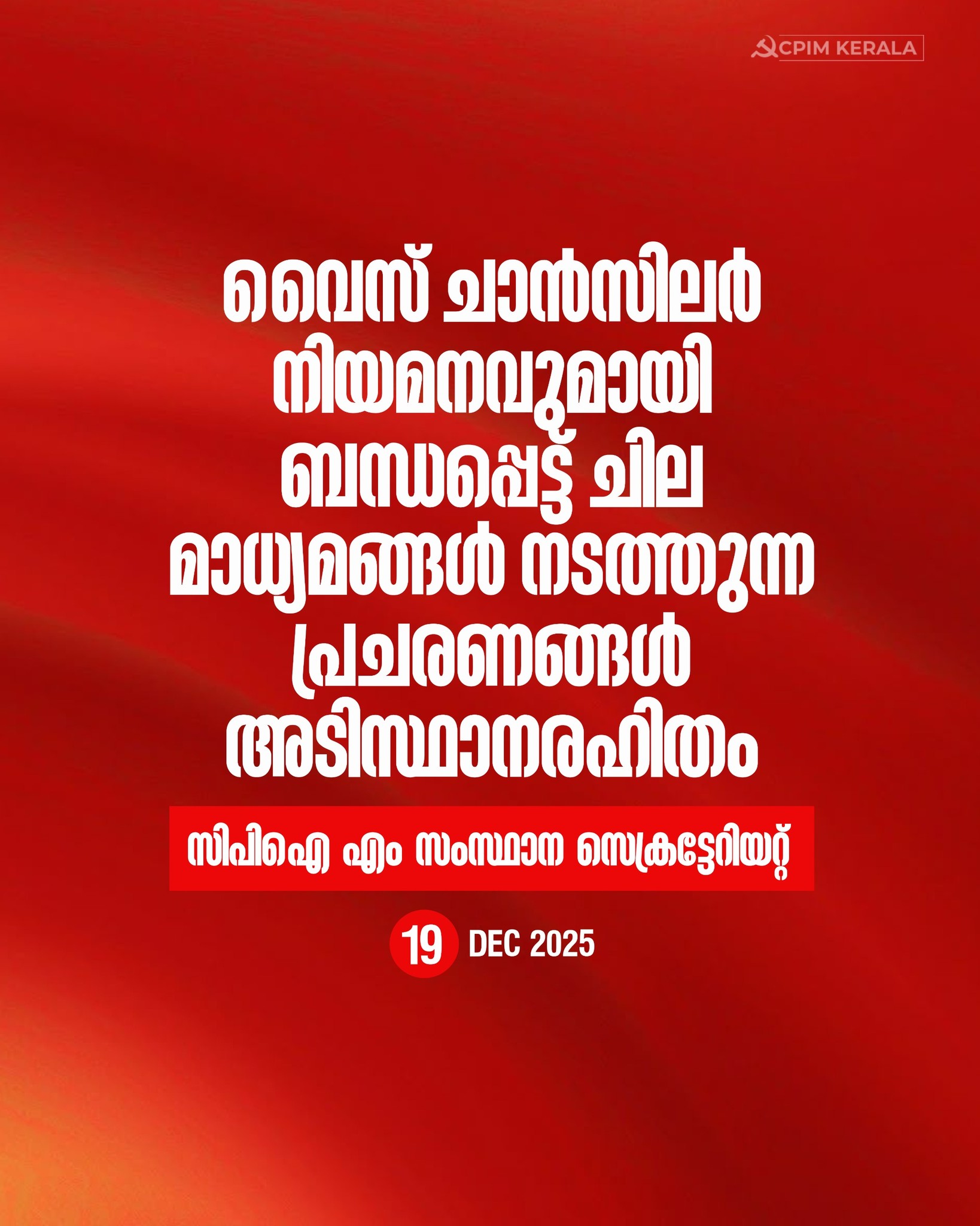 വൈസ് ചാന്സിലര് നിയമനവുമായി ബന്ധപ്പെട്ട് ചില മാധ്യമങ്ങള് നടത്തുന്ന പ്രചരണങ്ങള് അടിസ്ഥാന രഹിതമാണ്. കേരള ഡിജിറ്റല് സര്വ്വകലാശാല, കേരള സാങ്കേതിക സര്വ്വകലാശാല എന്നിവിടങ്ങളില് താല്ക്കാലിക വൈസ് ചാന്സിലറെ നിശ്ചയിക്കുന്നതിന് സര്ക്കാരിന്റെ അഭിപ്രായം ചാന്സിലറായ ഗവര്ണ്ണര് തേടേണ്ടതാണെന്ന് ഈ സര്വ്വകലാശാലകളിലെ ആക്ടുകള് വ്യക്തമാക്കുന്നുണ്ട്. ഇത് പരിഗണിക്കാതെ ഏകപക്ഷീയമായി താല്ക്കാലിക വൈസ് ചാന്സിലര്മാരെ ചാന്സിലറായ ഗവര്ണ്ണര് നിയമിക്കുകയാണ് ചെയ്തത്. നിയമവിരുദ്ധമായ ഈ നടപടിക്കെതിരെ സംസ്ഥാന സര്ക്കാര് ഹൈക്കോടതിയെ സമീപിച്ചു. ഹൈക്കോടതി സിംഗിള് ബെഞ്ചും, ഡിവിഷന് ബെഞ്ചും സര്ക്കാര് നിലപാടിനെ അംഗീകരിച്ചു. ഇതിനെതിരെ ചാന്സിലറായ ഗവര്ണ്ണര് സുപ്രീം കോടതിയെ സമീപിച്ചു. ഈ കേസില് സ്ഥിരം വൈസ് ചാന്സിലര്മാരെ നിയമിക്കാന് സുപ്രീം കോടതി നിര്ദ്ദേശിച്ചു.
