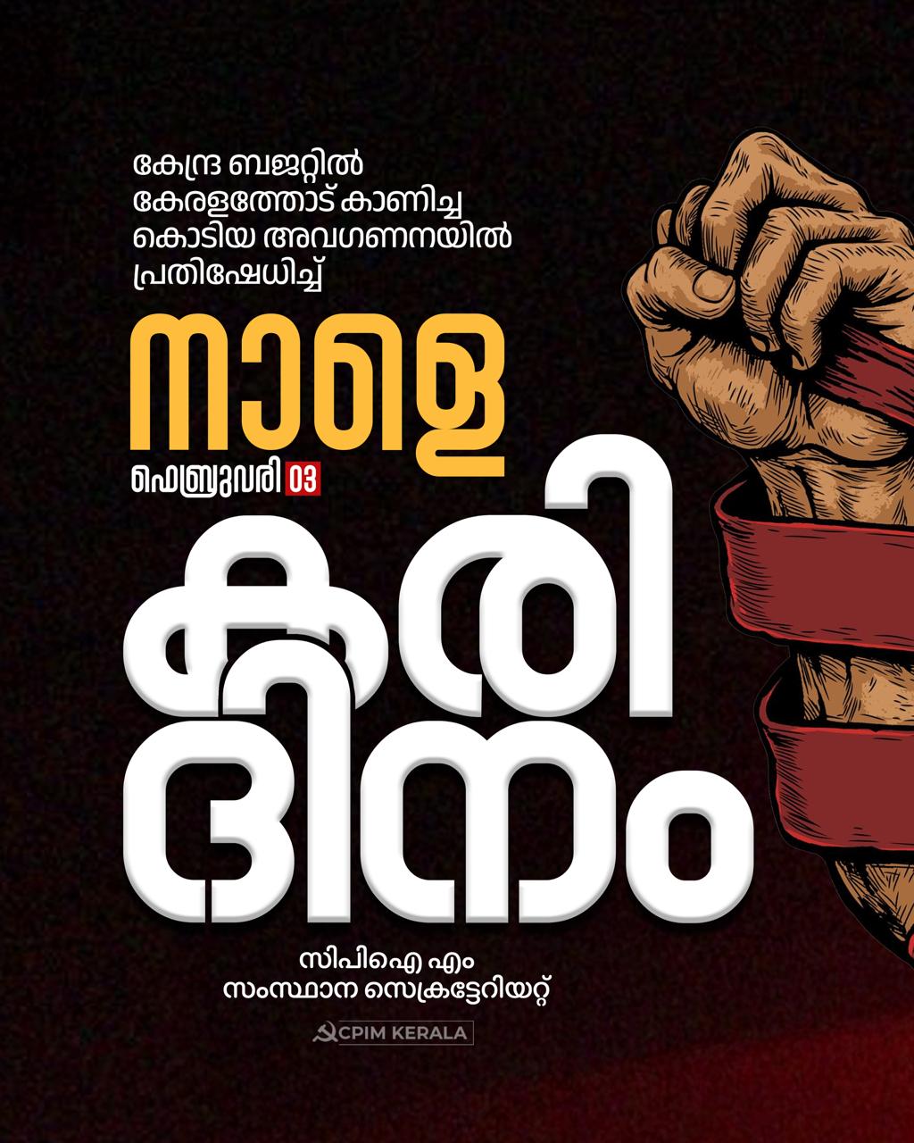 കേന്ദ്ര ബജറ്റില്‍ കേരളത്തോട്‌ കാണിച്ച കൊടിയ അവഗണനയില്‍ പ്രതിഷേധിച്ച്‌ ഫെബ്രുവരി 3-ാം തീയ്യതി കരിദിനമായി ആചരിക്കാന്‍ ആഹ്വാനം ചെയ്യുന്നു. ഇന്ത്യയുടെ ഭൂപടത്തില്‍ കേരളം നിലനില്‍ക്കുന്നില്ല എന്ന രീതിയിലുള്ള ബജറ്റാണ്‌ അവതരിപ്പിച്ചിട്ടുള്ളത്‌. ബജറ്റിന്‌ മുമ്പ്‌ കേന്ദ്ര ധനമന്ത്രിയുമായി നടത്തിയ ചര്‍ച്ചയില്‍ കേരളം 29 ആവശ്യങ്ങള്‍ ഉന്നയിച്ചിരുന്നു. ഇത്‌ ഒന്നുപോലും പരിഗണിച്ചില്ല. സംസ്ഥാനം ദീര്‍ഘകാലമായി ആവശ്യപ്പെടുന്ന ഒരു പദ്ധതിയും കേരളത്തിന്‌ ലഭിച്ചില്ല. കേരളത്തിന്റെ സ്വപ്‌നമായ എയിംസ്‌ ഈ ബജറ്റിലും പ്രഖ്യാപിച്ചില്ല. റെയില്‍വെ വികസനത്തിനായുള്ള 7 അതിവേഗ ഇടനാഴികളിലും കേരളമില്ല. വിഴിഞ്ഞം തുറമുഖത്തിന്റെ വികസനത്തിനുള്ള. പ്രത്യേക പാക്കേജും അംഗീകരിക്കപ്പെട്ടില്ല. ആയുര്‍വ്വേദത്തിന്റെ ഈറ്റില്ലമായ കേരളത്തിന്‌ ആയുര്‍വ്വേദ എയിംസ്‌ ഇല്ല. ഉള്‍നാടന്‍ ജല ഗതാഗത പദ്ധതിയിലും കേരളമില്ല.