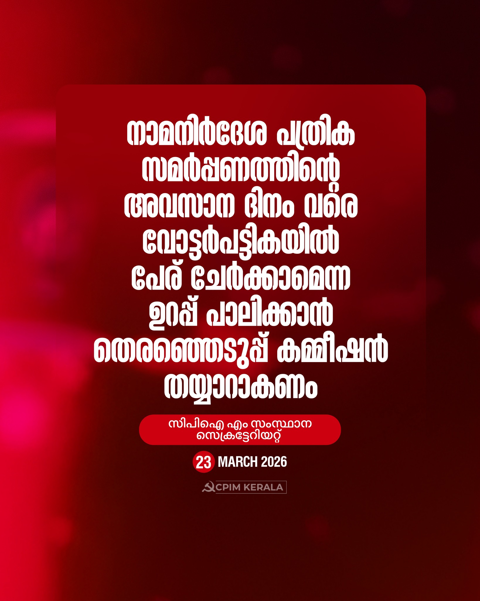 നാമനിര്ദേശ പത്രികാ സമര്പ്പണത്തിന്റെ അവസാന ദിവസം വരെ അപേക്ഷ നല്കി വോട്ടര്പട്ടികയില് പേര് ചേര്ക്കാമെന്ന ഉറപ്പ് പാലിക്കാന് തെരഞ്ഞെടുപ്പ് കമ്മീഷന് തയ്യാറാകണം. മാര്ച്ച് 15-ന് ശേഷമുള്ള അപേക്ഷകള് പരിഗണിക്കില്ലെന്ന് വ്യക്തമാക്കിയുള്ള തെരഞ്ഞെടുപ്പ് കമ്മീഷന്റെ വാര്ത്താക്കുറിപ്പ്, വോട്ടവകാശമെന്ന ഭരണഘടനാപരമായ അവകാശത്തിന് മേലുള്ള കടന്നുകയറ്റമാണ്. ലക്ഷക്കണക്കിന് പേര്ക്ക് വോട്ടവകാശം നിഷേധിക്കാന് തെരഞ്ഞെടുപ്പ് കമ്മീഷന്റെ ഈ തീരുമാനം കാരണമാകും.