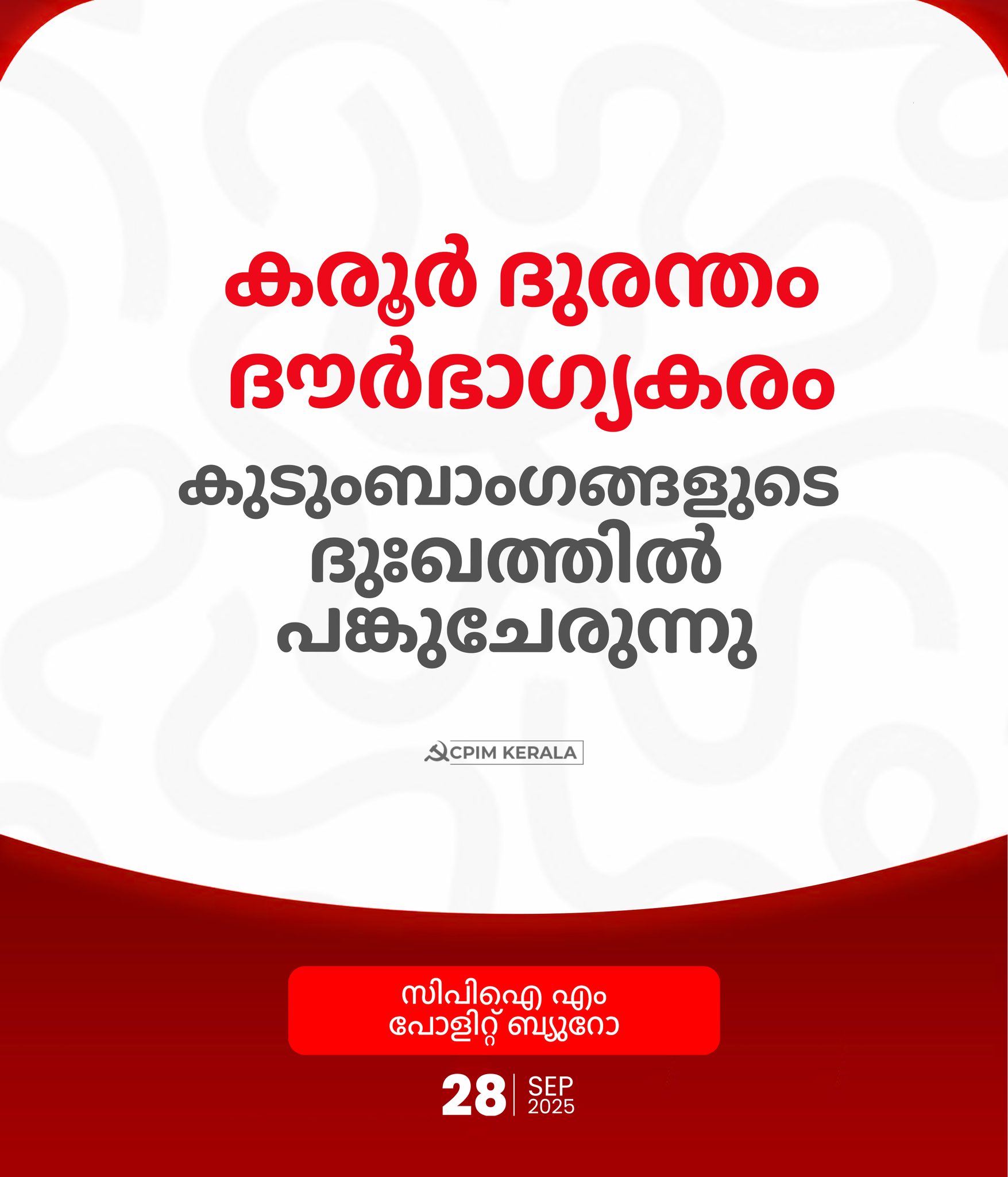 കരൂർ ദുരന്തത്തിൽ ഞെട്ടലും ദുഃഖവും രേഖപ്പെടുത്തുന്നു. തമിഴ്നാട്ടിലെ കരൂരിൽ ടിവികെ പാർടി സ്ഥാപകനും ചലച്ചിത്ര നടനുമായ വിജയ് നയിച്ച രാഷ്ട്രീയ റാലിക്കിടെ തിക്കിലും തിരക്കിലും പെട്ട് 40 പേരാണ് കൊല്ലപ്പെട്ടത്. അപകടത്തിൽ നിരവധി പേർക്ക് പരിക്കേറ്റു. സിനിമാതാരത്തെ കാണാൻ തടിച്ചുകൂടിയ ആളുകൾക്ക് സംഘാടകനത്തിലെ പിഴവും തദ്ദേശ സ്വയംഭരണ സ്ഥാപനങ്ങളുടെ കെടുകാര്യസ്ഥതയും കാരണം ജീവൻ നഷ്ടപ്പെട്ടത് ദൗർഭാഗ്യകരമാണ്. അപ്രതീക്ഷിതമായ ഈ ദുരന്തത്തിൽ മരിച്ചവരുടെ കുടുംബാംഗങ്ങളുടെ ദുഃഖത്തിൽ പങ്കുചേരുന്നു.