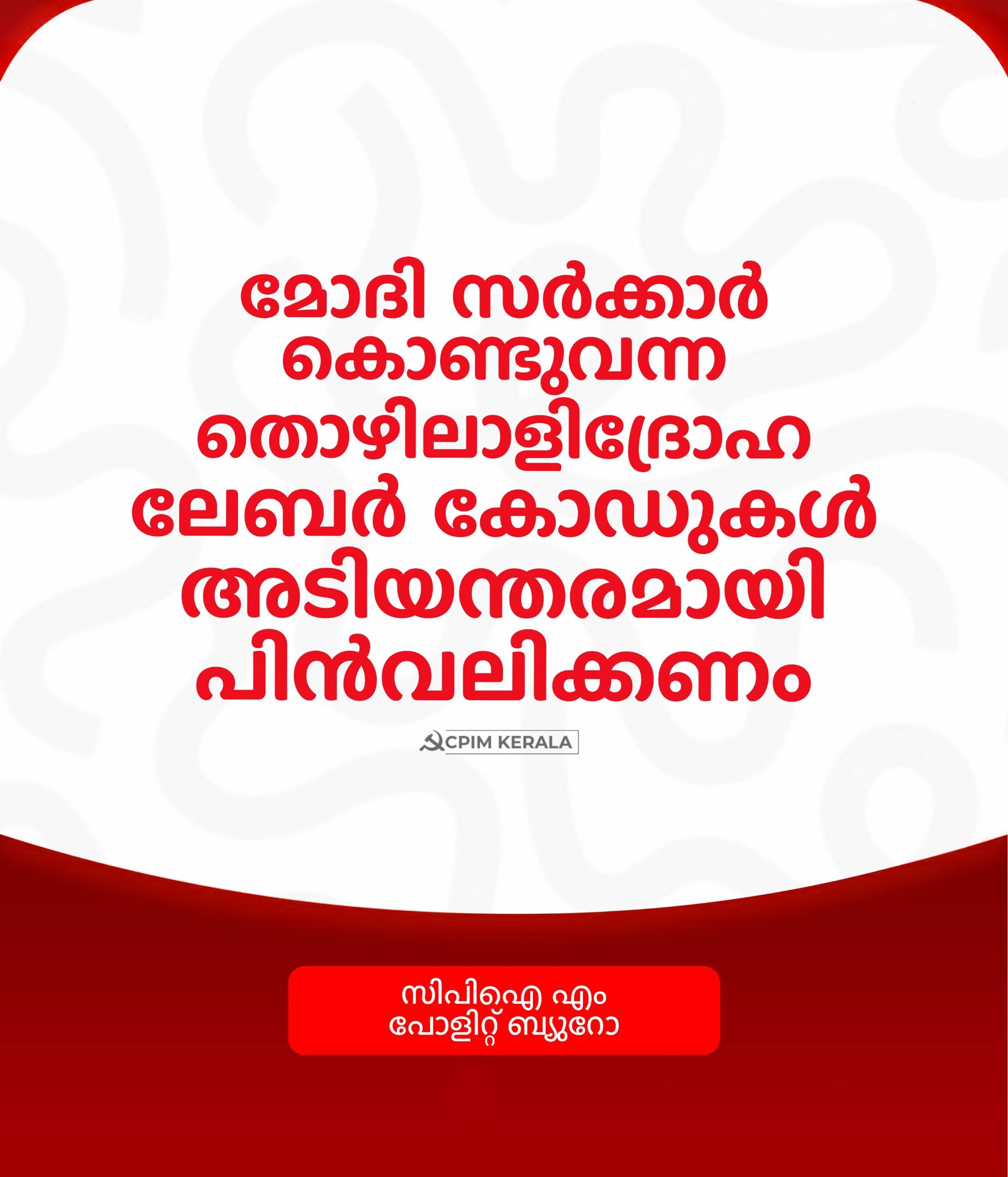 മോദി സർക്കാർ കൊണ്ടുവന്ന തൊഴിലാളിദ്രോഹ ലേബർ കോഡുകൾ അടിയന്തരമായി പിൻവലിക്കണം. ട്രേഡ് യൂണിയനുകളും ജനാധിപത്യശക്തികളും ഐക്യത്തോടെ പ്രക്ഷോഭമുയർത്തണം. സർക്കാരിന്റെ ഏകാധിപത്യ സമീപനം ചെറുത്ത് തൊഴിലാളികളുടെ അവകാശങ്ങളും ആനുകൂല്യങ്ങളും സംരക്ഷിക്കുകയും കൂടുതൽ സമഗ്രതയോടെ ഉറപ്പുവരുത്തുകയും വേണം. പോരാട്ടങ്ങളിലൂടെ നേടിയെടുത്തതും തൊഴിലാളികളെ ഒരു പരിധിവരെ സംരക്ഷിച്ചിരുന്നതുമായ 29 തൊഴിൽ നിയമങ്ങളാണ് റദ്ദായത്. പരാധീനതകളുണ്ടായിരുന്നെങ്കിലും ഒരു പരിധിവരെ വേതനം, തൊഴിൽസമയം, സാമൂഹ്യസുരക്ഷ, വ്യവസായ സുരക്ഷ, പരിശോധനാ സംവിധാനങ്ങൾ, കൂട്ടായ വിലപേശൽ എന്നിവ സാധ്യമായിരുന്നു. എന്നാല്, നിയമം ലളിതമാക്കാനെന്ന പേരില് കൊണ്ടുവന്ന കോഡുകള് പൂർണമായും തൊഴിലുടമകൾക്ക് അനുകൂലമായി മാറി. കൂടുതൽ തൊഴിൽ സൃഷ്ടിക്കാനും നിക്ഷേപത്തിനും ഇതു വഴിവയ്ക്കുമെന്ന വാദം പൊള്ളയാണ്.