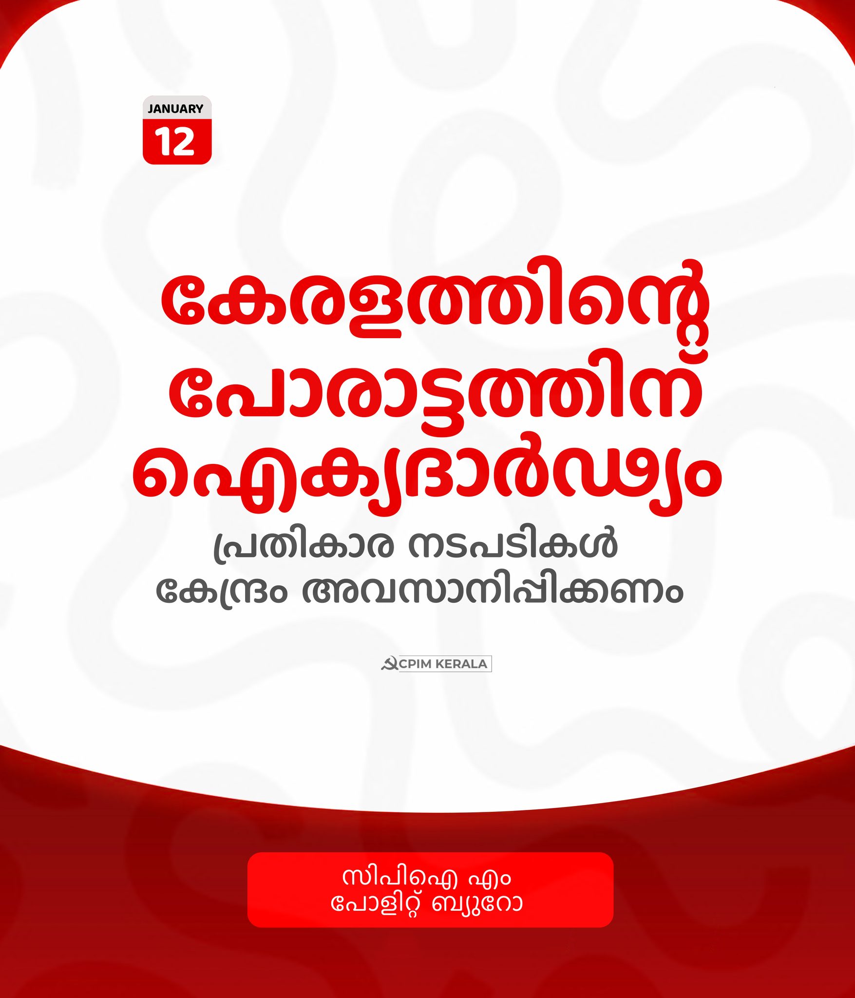 കേന്ദ്രസർക്കാർ കേരളത്തോട് സ്വീകരിക്കുന്ന കടുത്ത ഉപരോധനയത്തിനെതിരെ മുഖ്യമന്ത്രിയുടെ നേതൃത്വത്തിൽ തിരുവനന്തപുരം രക്തസാക്ഷി മണ്ഡപത്തിൽ സംഘടിപ്പിച്ച സത്യഗ്രഹ സമരത്തിന് ഐക്യദാര്ഢ്യം. കേന്ദ്രത്തിന്റെ ഔദാര്യമല്ല, മറിച്ച് അർഹമായ അവകാശങ്ങൾ മാത്രമാണ് കേരളം ആവശ്യപ്പെടുന്നത്. സംസ്ഥാനത്തോടുള്ള സാമ്പത്തിക പ്രതികാര നടപടികൾ കേന്ദ്രം അവസാനിപ്പിക്കണം.