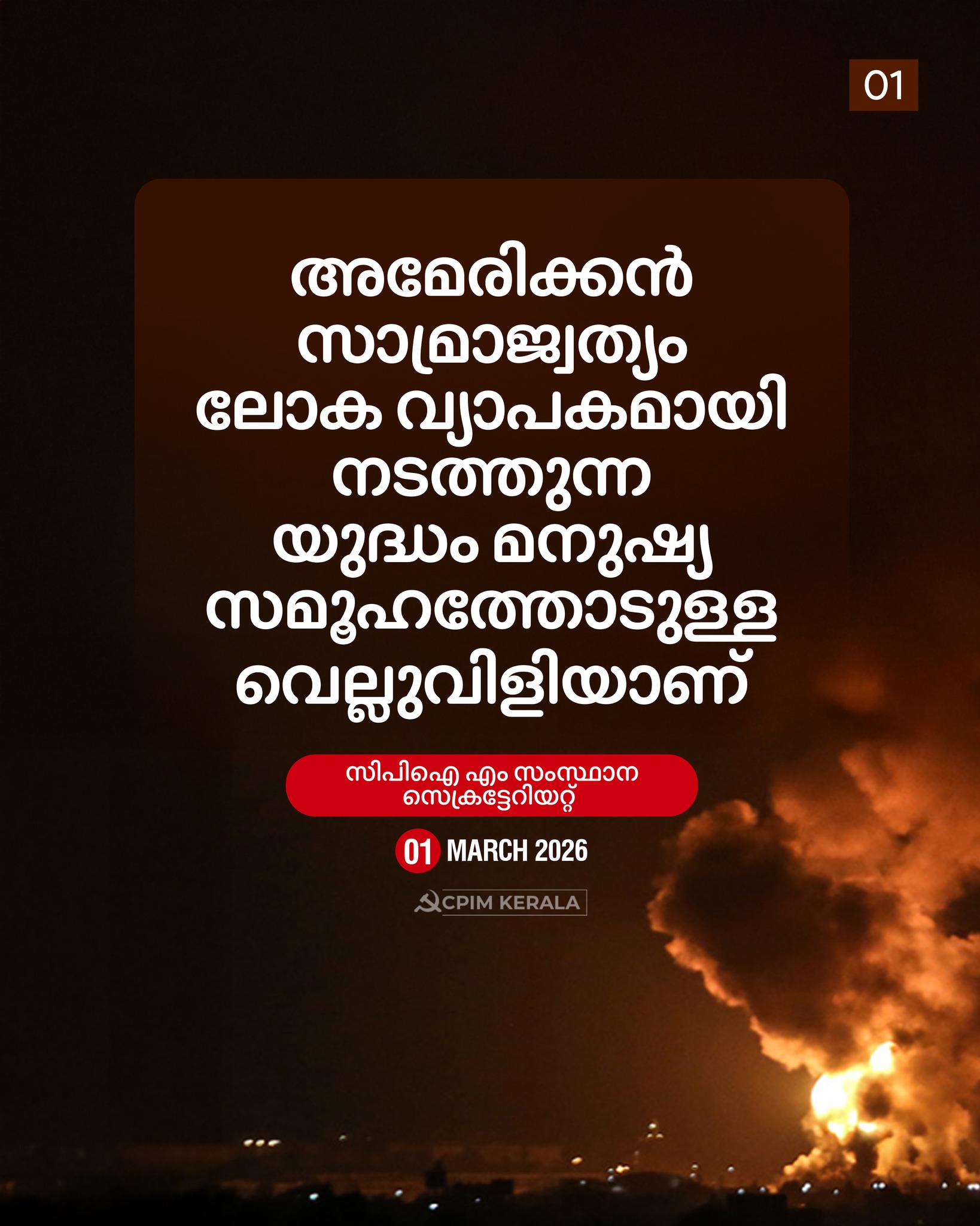 ലോകത്തെ വിഭവങ്ങളെ കൈപ്പിടിയില്ലാക്കുകയെന്ന ലക്ഷ്യത്തോടുകൂടിയാണ് തങ്ങള്ക്ക് വഴങ്ങാത്ത രാജ്യങ്ങളെ തകര്ക്കുന്ന നയം സ്വീകരിക്കുന്നത്. ഗാസയിലും ഉക്രൈനിലും ചോരപ്പുഴ ഒഴുക്കുന്നതിന് കാരണമായി തീര്ന്നത് അമേരിക്കയുടെ ഈ നയം തന്നെയാണ്. കേരളത്തെ സംബന്ധിച്ചിടത്തോളം ഈ യുദ്ധാന്തരീക്ഷം ഏറെ ആശങ്ക ഉളവാക്കുന്നതാണ്. മലയാളികള് ഏറെ താമസിക്കുന്നതും നമ്മുടെ സമ്പദ്ഘടനയുടെ നട്ടെല്ലായ പ്രവാസികളുടെ ജീവിതത്തില് കരിനിഴല് വീഴ്ത്തുന്ന സംഭവമായി ഇത് മാറുകയാണ്. നൂറ്റാണ്ടുകളായി കേരളവുമായി മികച്ച ബന്ധം പുലര്ത്തുന്ന ഗള്ഫ് മേഖലയില് ഉണ്ടാകുന്ന ഈ യുദ്ധാന്തരീക്ഷം കേരളത്തിലെ ഓരോ കുടുംബത്തിലും ഏറെ ആശങ്ക ഉളവാക്കുന്നതാണ്.