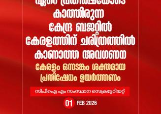 02/02/2026കേന്ദ്ര ബജറ്റില് കേരളത്തോട് കാണിച്ച കൊടിയ അവഗണനയില് പ്രതിഷേധിച്ച് ഫെബ്രുവരി 3-ാം തീയ്യതി കരിദിനമായി ആചരിക്കാന് ആഹ്വാനം ചെയ്യുന്നു. ഇന്ത്യയുടെ ഭൂപടത്തില് കേരളം നിലനില്ക്കുന്നില്ല എന്ന രീതിയിലുള്ള ബജറ്റാണ് അവതരിപ്പിച്ചിട്ടുള്ളത്.