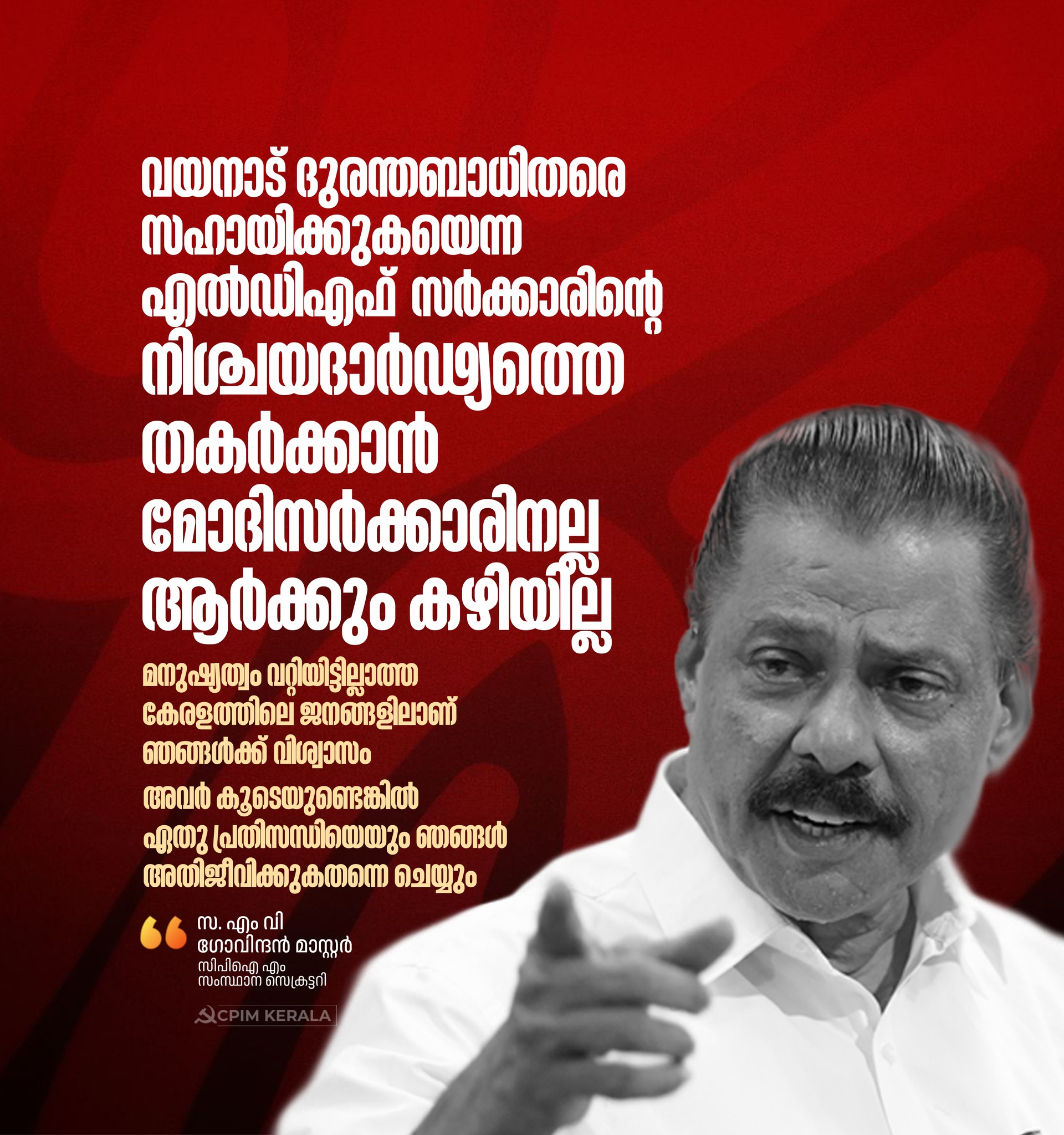 അർഹമായ സഹായം നിഷേധിച്ച് ദുരന്തബാധിതരെ കേന്ദ്രം കൈയൊഴിയുമ്പോഴും അവരെ ചേർത്തുപിടിച്ച്, താങ്ങും തണലുമാകാൻ കേരളത്തിലെ ഇടതുപക്ഷപ്രസ്ഥാനങ്ങളും പിണറായി വിജയൻ സർക്കാരും തയ്യാറാകുകതന്നെ ചെയ്യും. മുണ്ടക്കൈ ടൗൺഷിപ്പിൽ വീടുകളുടെയും അനുബന്ധസൗകര്യങ്ങളുടെയും പണി അതിവേഗത്തിൽ പുരോഗമിക്കുകയാണ്. ദുരന്തബാധിതരെ സഹായിക്കുകയെന്ന എൽഡിഎഫ് സർക്കാരിന്റെ നിശ്ചയദാർഢ്യത്തെ തകർക്കാൻ മോദിസർക്കാരിനല്ല ആർക്കും കഴിയില്ല. മനുഷ്യത്വം വറ്റിയിട്ടില്ലാത്ത കേരളത്തിലെ ജനങ്ങളിലാണ് ഞങ്ങൾക്ക് വിശ്വാസം. അവർ കൂടെയുണ്ടെങ്കിൽ ഏതു പ്രതിസന്ധിയെയും ഞങ്ങൾ അതിജീവിക്കുകതന്നെ ചെയ്യും.