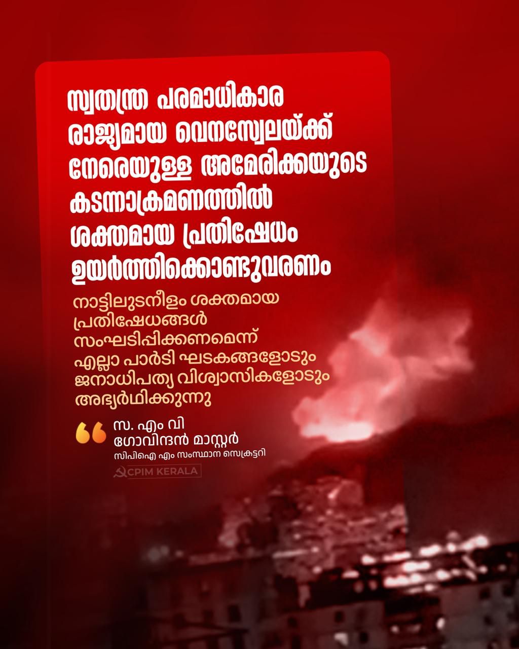 കുറച്ച് ആഴ്ചകളായി വെനിസ്വേലയ്ക്ക് ചുറ്റും അമേരിക്ക സൈനിക, നാവിക സേനകളെ അണിനിരത്തിയിരിക്കുകയായിരുന്നു. ബോംബാക്രമണം നടത്തിയും പ്രസിഡന്റിനെ തടവിലാക്കിയും വെനസ്വേല എന്ന രാജ്യത്തിന്റെ പരാമാധികാരത്തിൽ കടന്നുകയറുന്നത് കോർപറേറ്റുകളുടെ താൽപര്യം സംരക്ഷിക്കാനാണ്. ഇതിനെതിരായി നാട്ടിലുടനീളം ശക്തമായ പ്രതിഷേധങ്ങൾ സംഘടിപ്പിക്കണമെന്ന് എല്ലാ പാർടി ഘടകങ്ങളോടും ജനാധിപത്യ വിശ്വാസികളോടും അഭ്യർഥിക്കുന്നു.